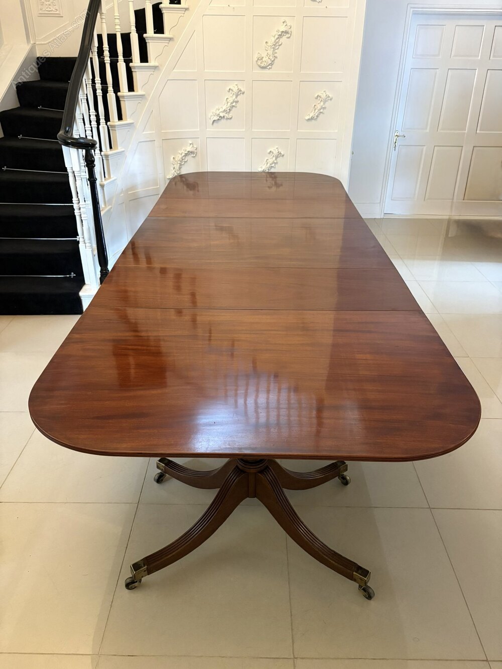 Outstanding quality antique regency 16/18 seater figured mahogany 3 pilar dining table having a magnificent quality figured mahogany reeded edge top with 2 original extra leaves supported on fabulous turned pedestal columns standing on 4 splayed shaped reeded sabre legs with original brass castors.