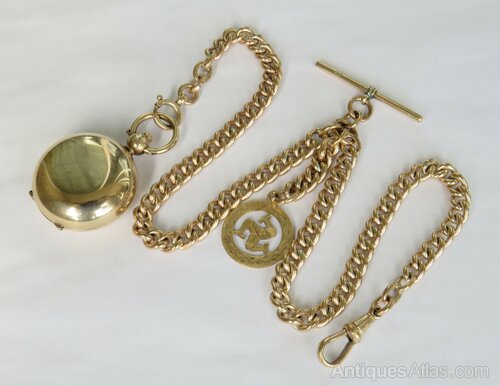 Each of the chains measures 23cm long including the T-bar and the clasp. The T-bar is a later brass replacement. The chain is stamped “warranted 18ct rolled gold”.