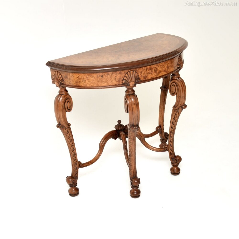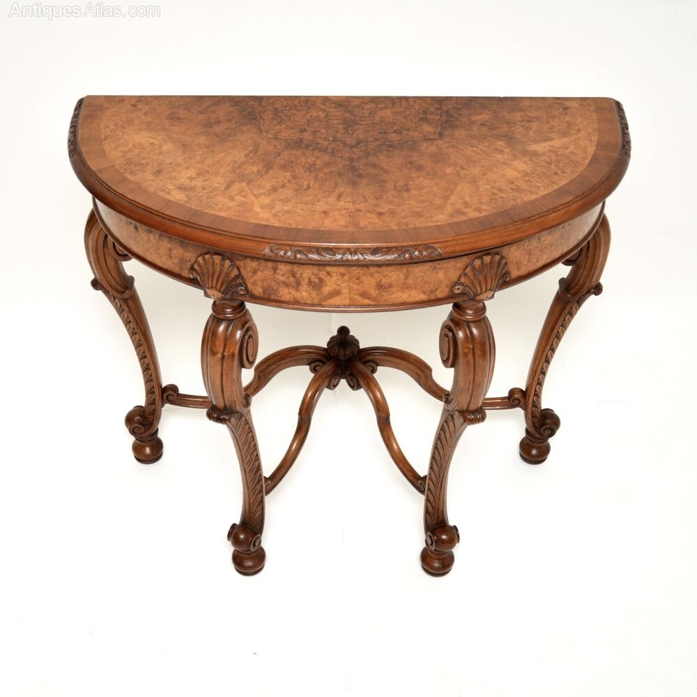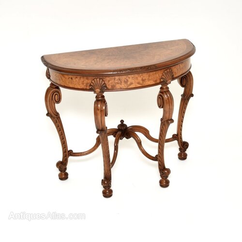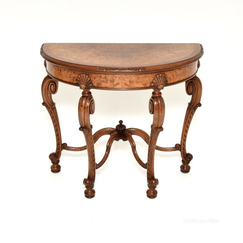 A stunning antique burr walnut console side table by Maple and Co. This was made in England, it dates from around the 1890-1910 period.