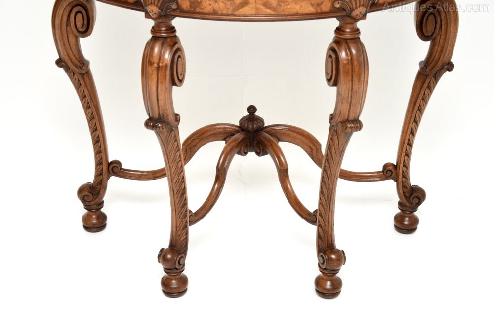 It is of extremely fine quality, with stunning burr walnut grain patterns and beautifully intricate carving. The legs are scrolled with acanthus leaf carving on the front edges, and shell carving at the top. The top is nicely cross banded, this has the Maple and Co. badge under the top.