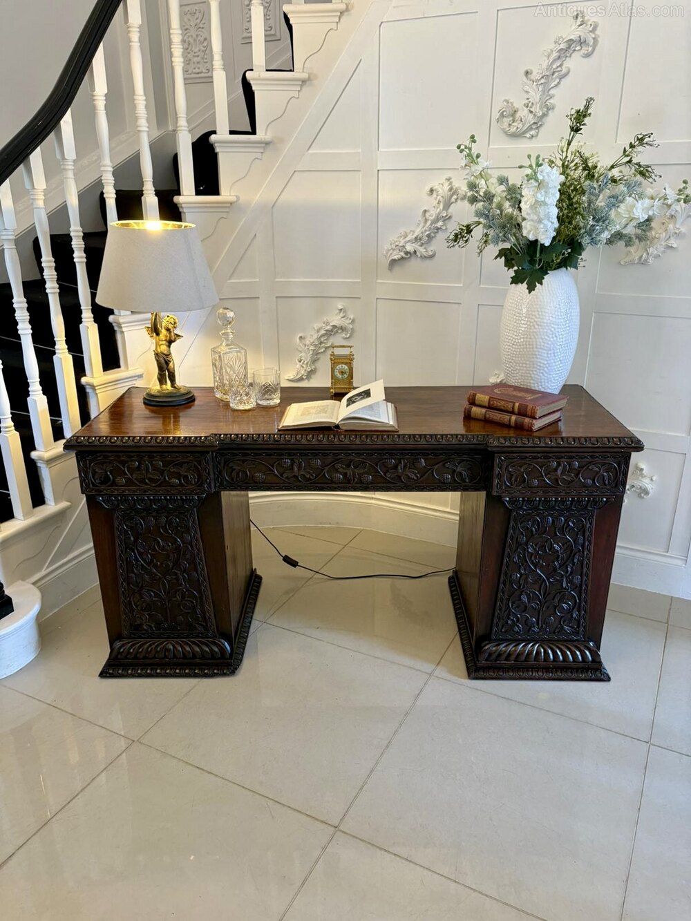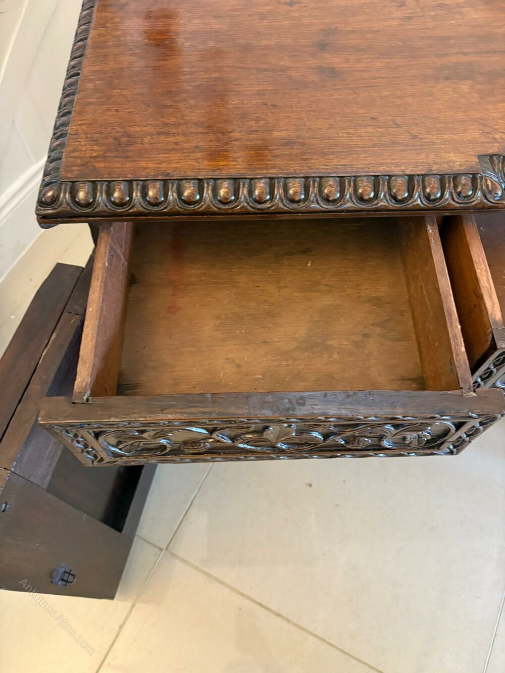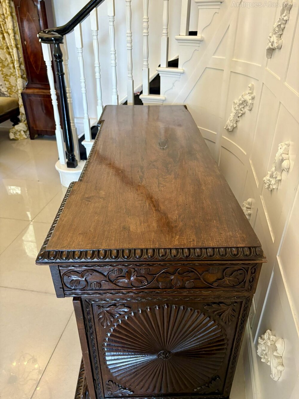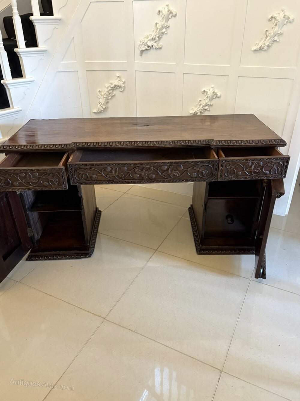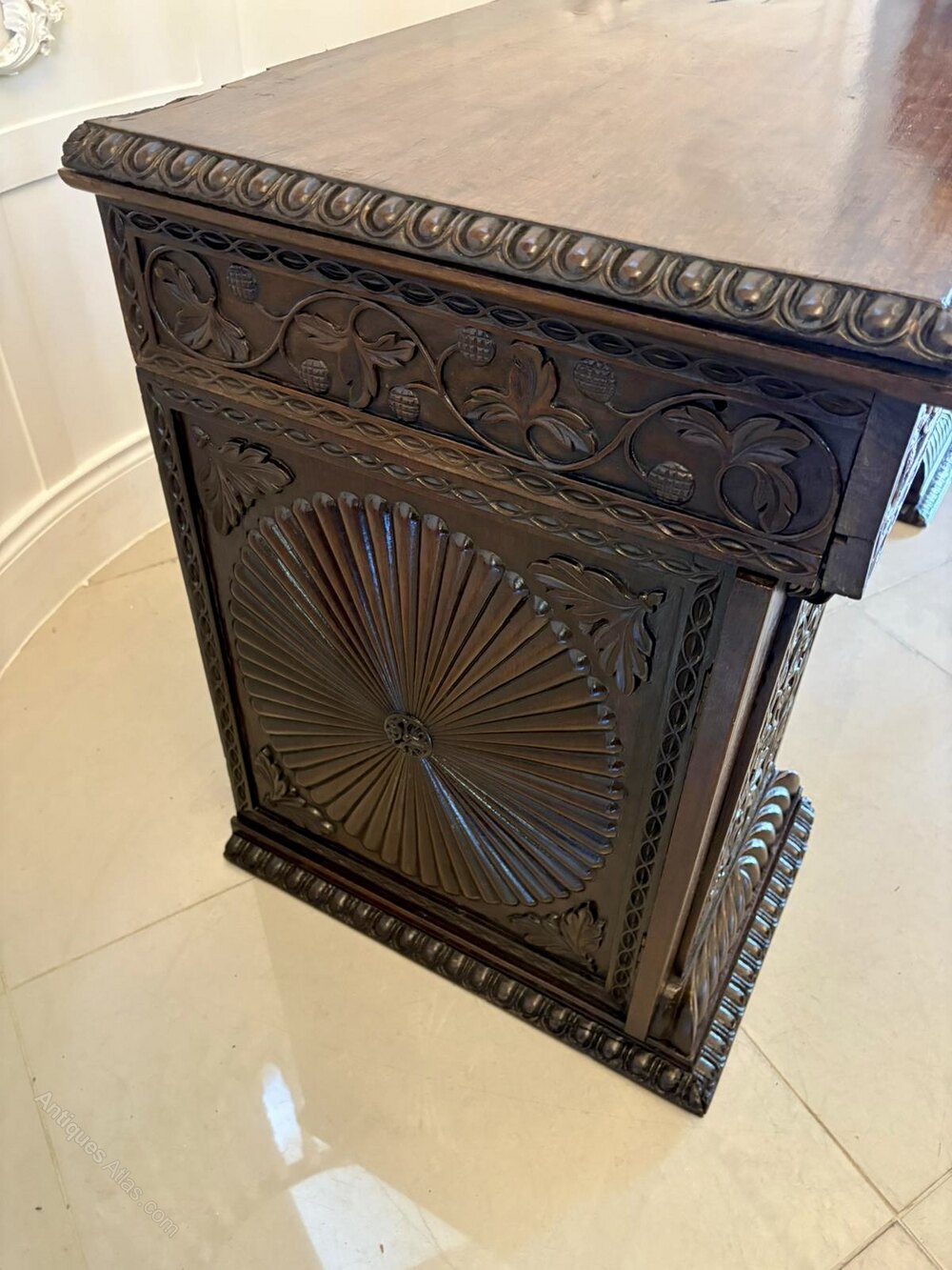 Antique ornate small carved Anglo-Indian padauk inverted breakfront pedestal sideboard having an inverted padauk top with an ornate carved edge above a large central carved fronted drawer flanked by two smaller drawers above two pedestals with carved doors opening to reveal a shelved section to the left pedestal and a shelf and cellerette to the right. The pedestals stand on beautifully carved plinth bases with exceptional ornate carving of the highest quality to each side.