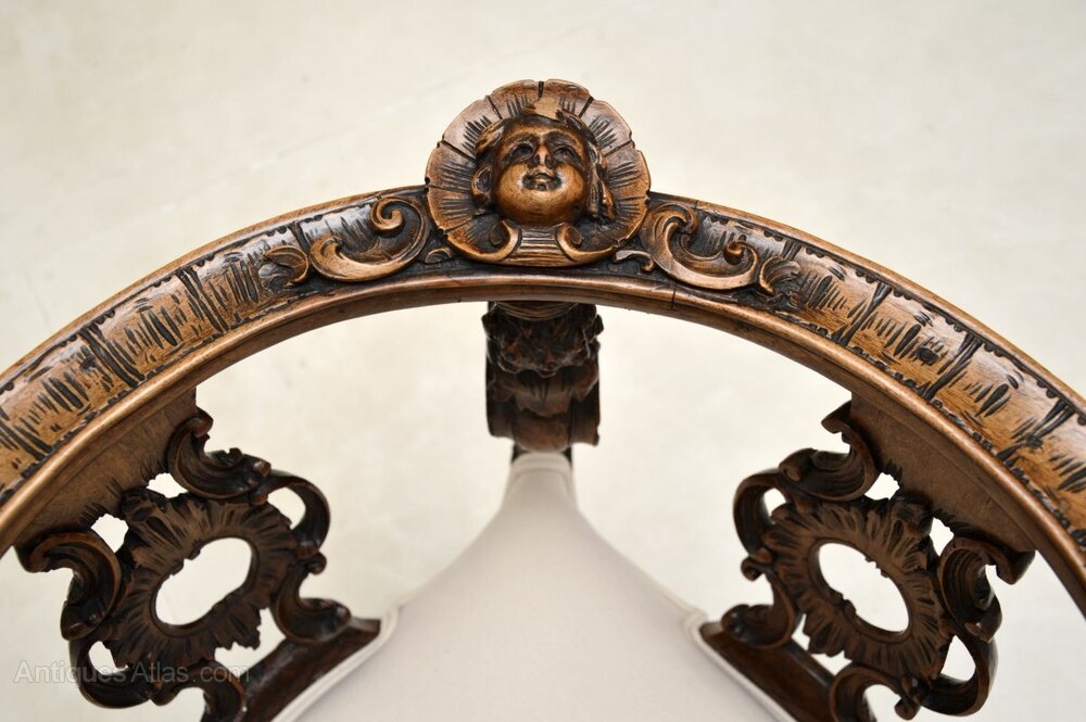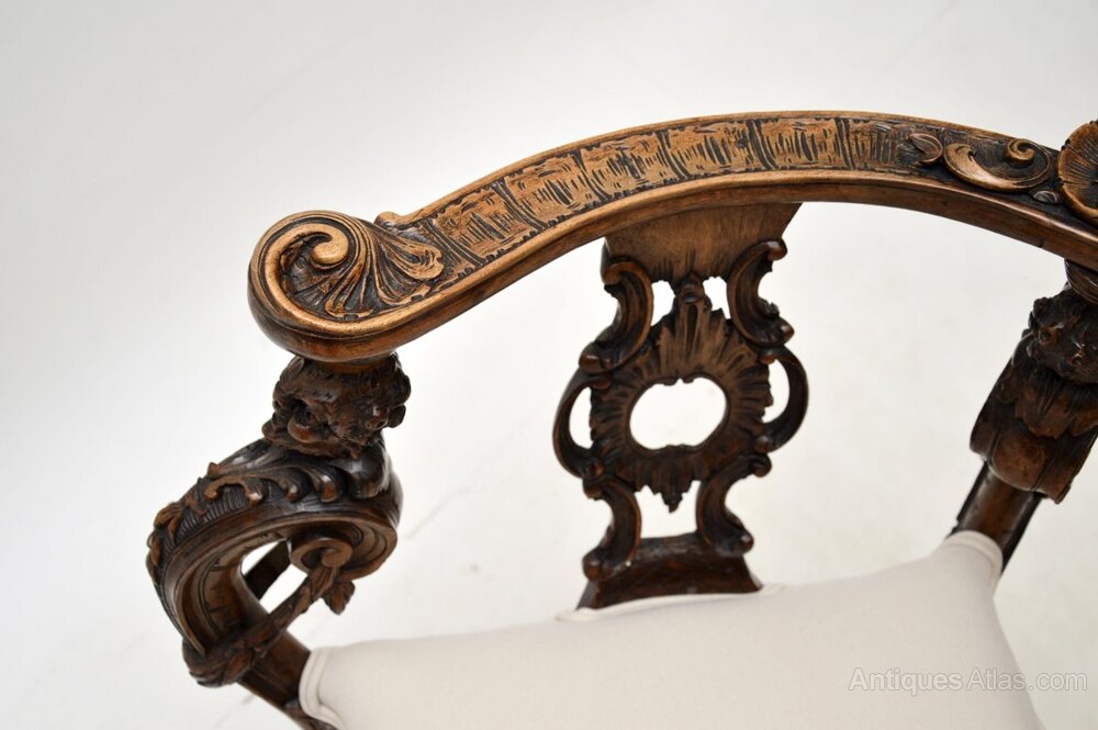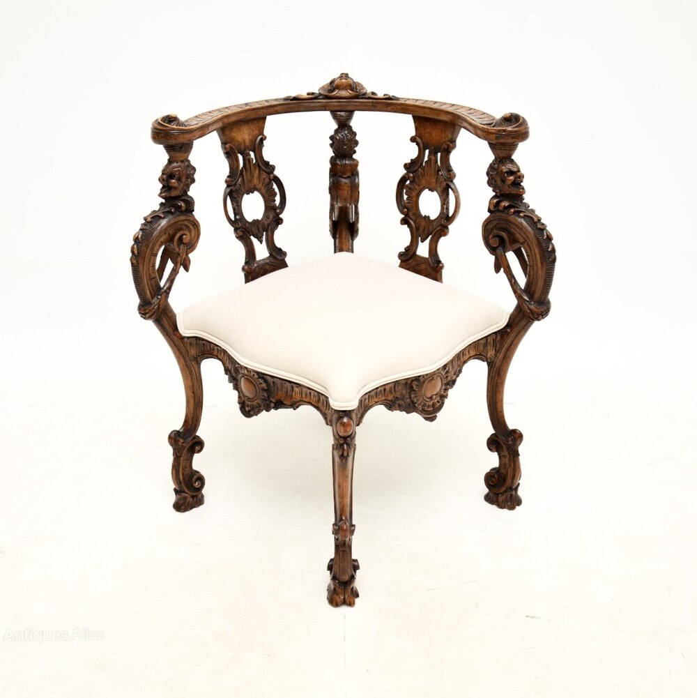 A beautiful and impressive antique carved walnut corner chair. This was most likely made in Italy, we would date it to around the 1790’s period.