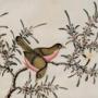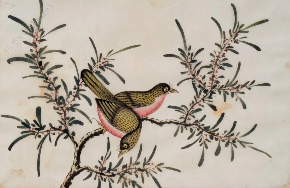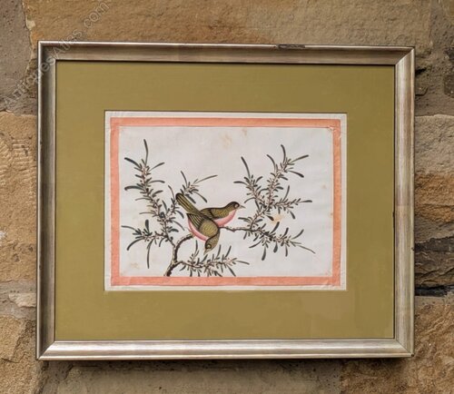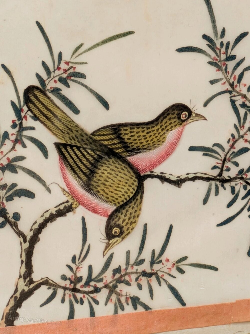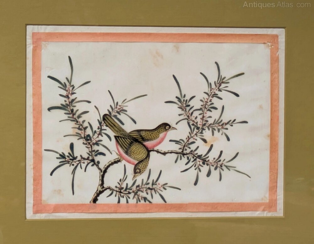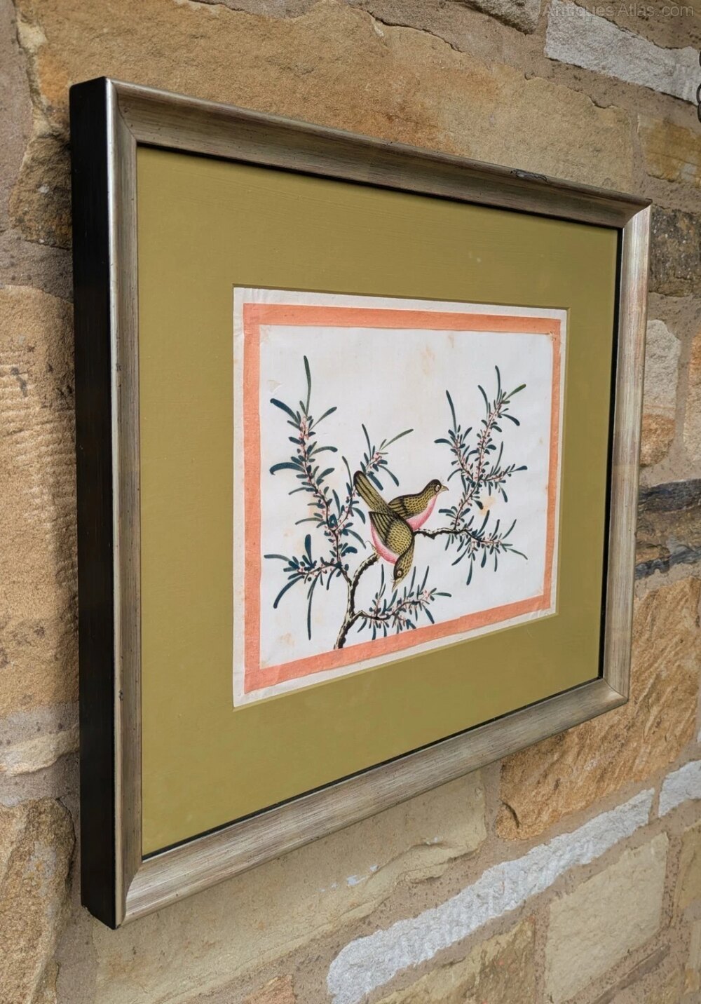 This is a beautiful Chinese gouache watercolour study of birds dating from the mid 19th Century. The painting depicts the birds in a naturalistic setting and is extremely well executed. Painted on pith in strong gouache colours, this in really good condition for its age. The watercolour is framed by a single narrow peach ribbon as was typical of the time and has recently been mounted and displayed in a good quality Italian silver gilt frame which suit the work beautifully.