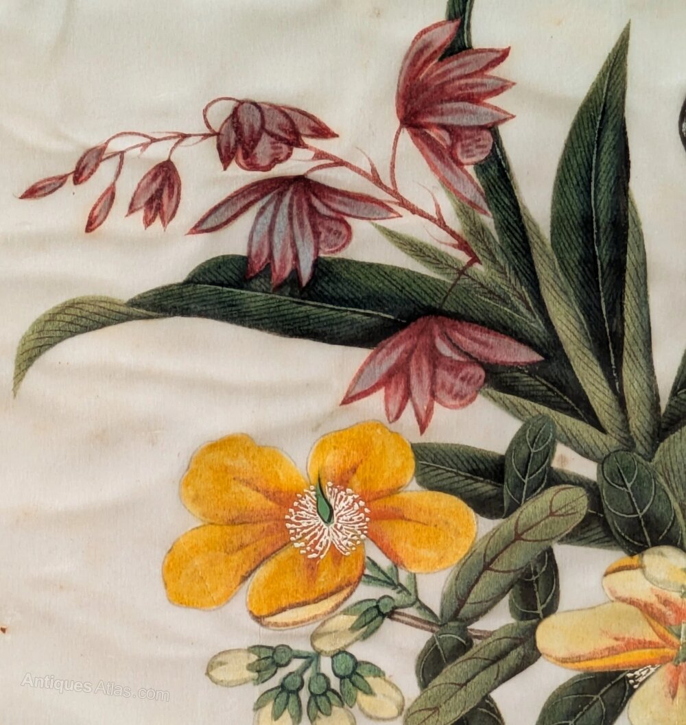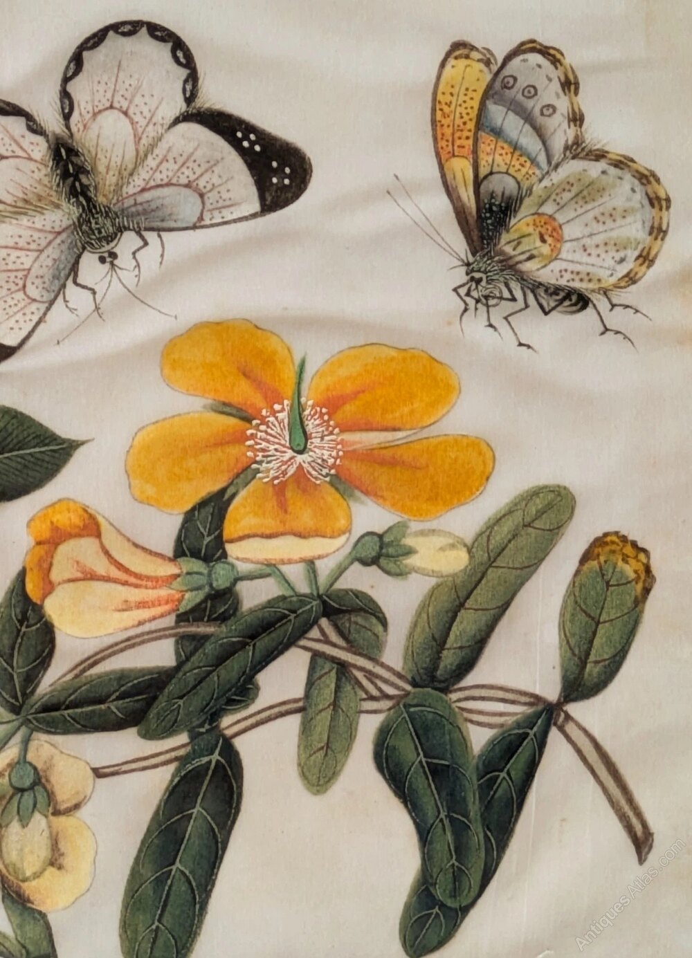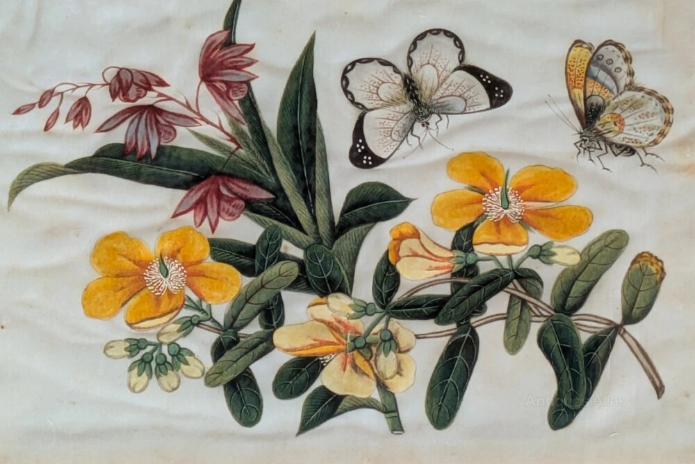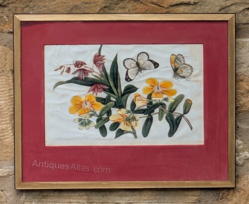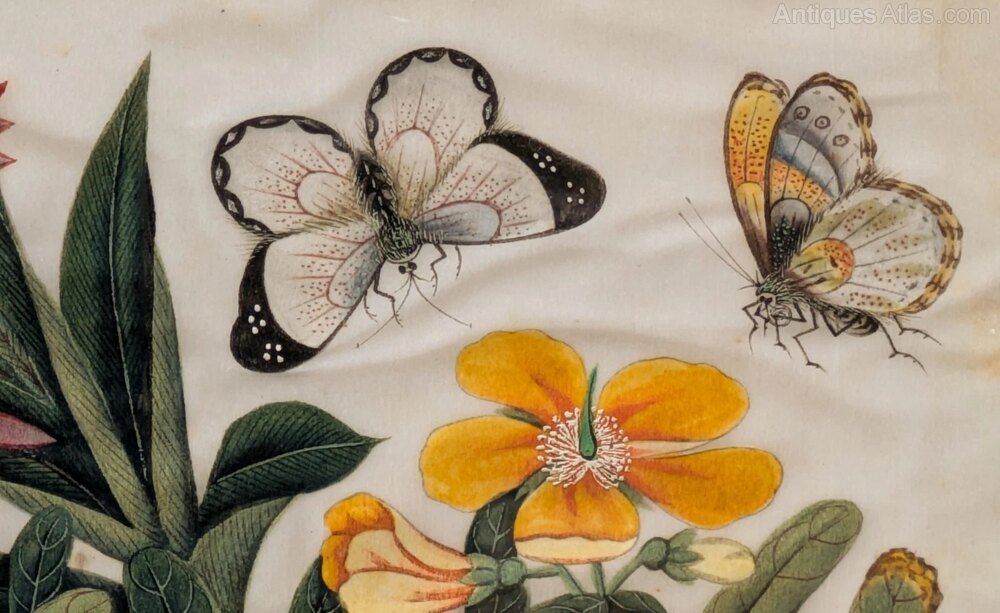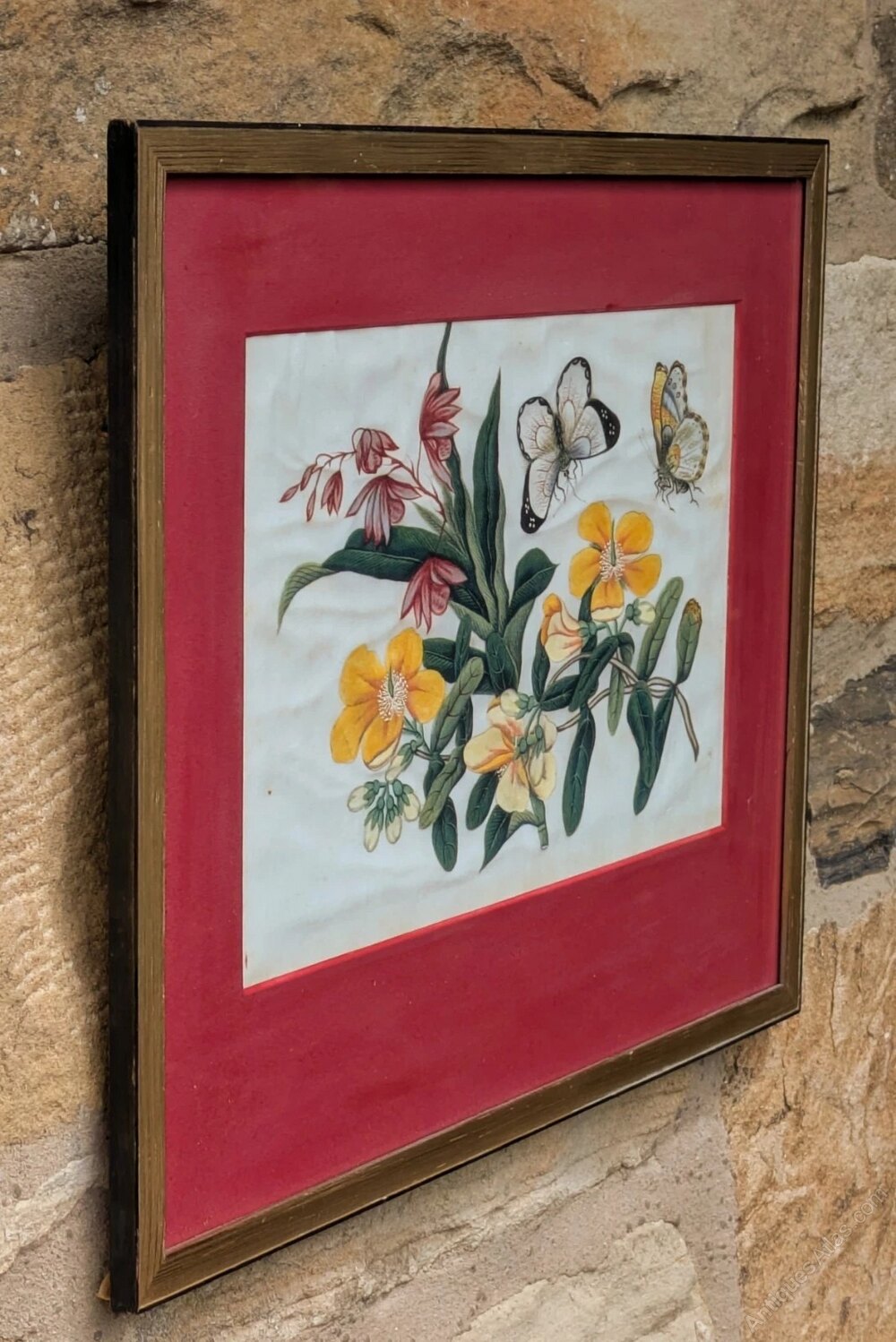 This is a beautiful antique Chinese (Qing) botanical watercolour dating from the mid 19th Century. The well executed painting depicts butterfles surrounded by native flora. The watercolour is in stunning bold gouache colours on pith and is presented in a neat gilt frame with a soft rapberry mount. It is in good condition and measures 38 cms by 28 cms overall including the frame.