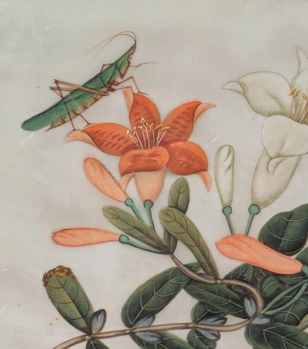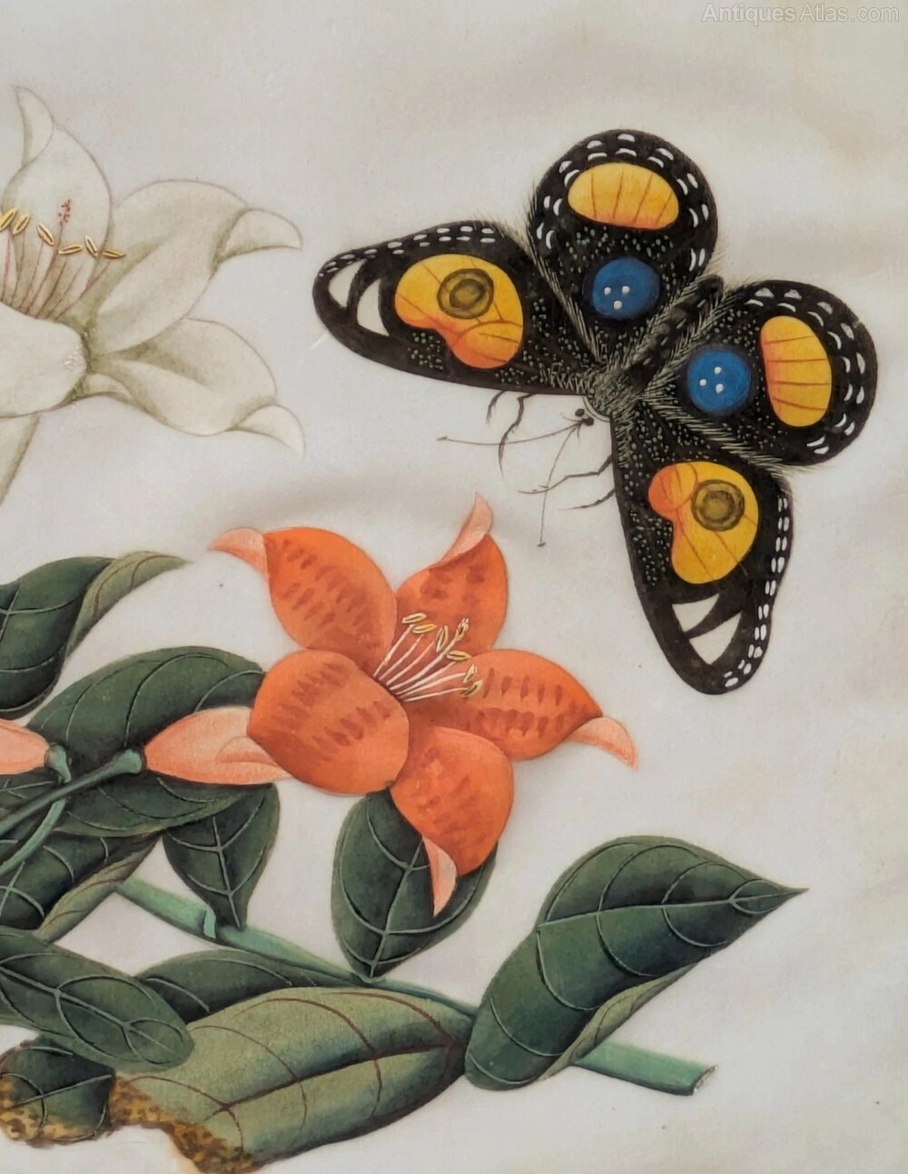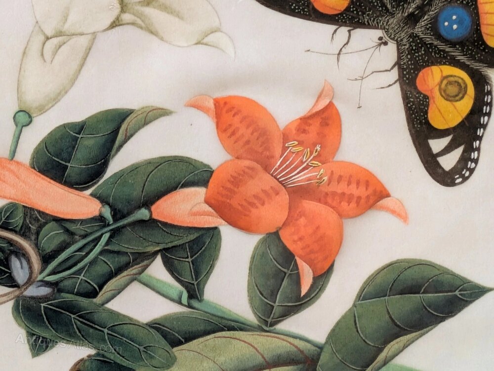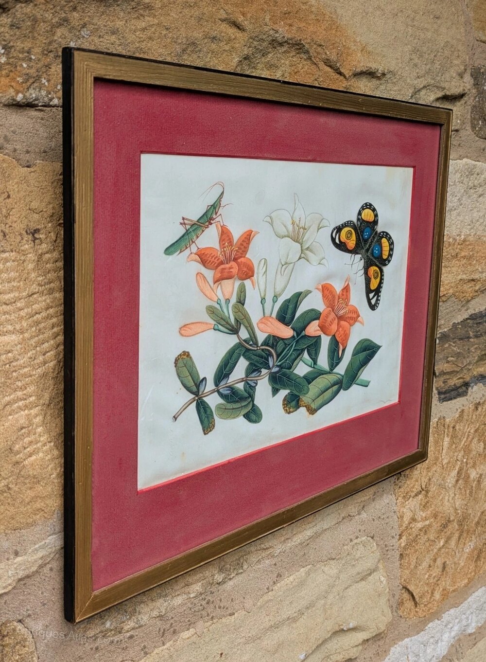 This is a beautiful antique Chinese botanical (Qing) watercolour dating from the mid 19th Century. The well executed painting depicts insects and a butterfly surrounded by native flora.The watercolour is in strong gouache colours on pith and is presented in a neat gilt frame with a raspberry mount. It is in good condition with no breaks to the pith and measures 36 cms by 28 cms overall including the frame.