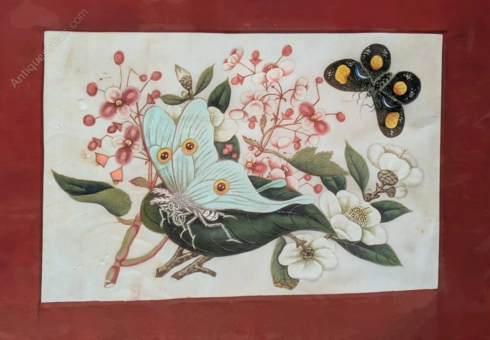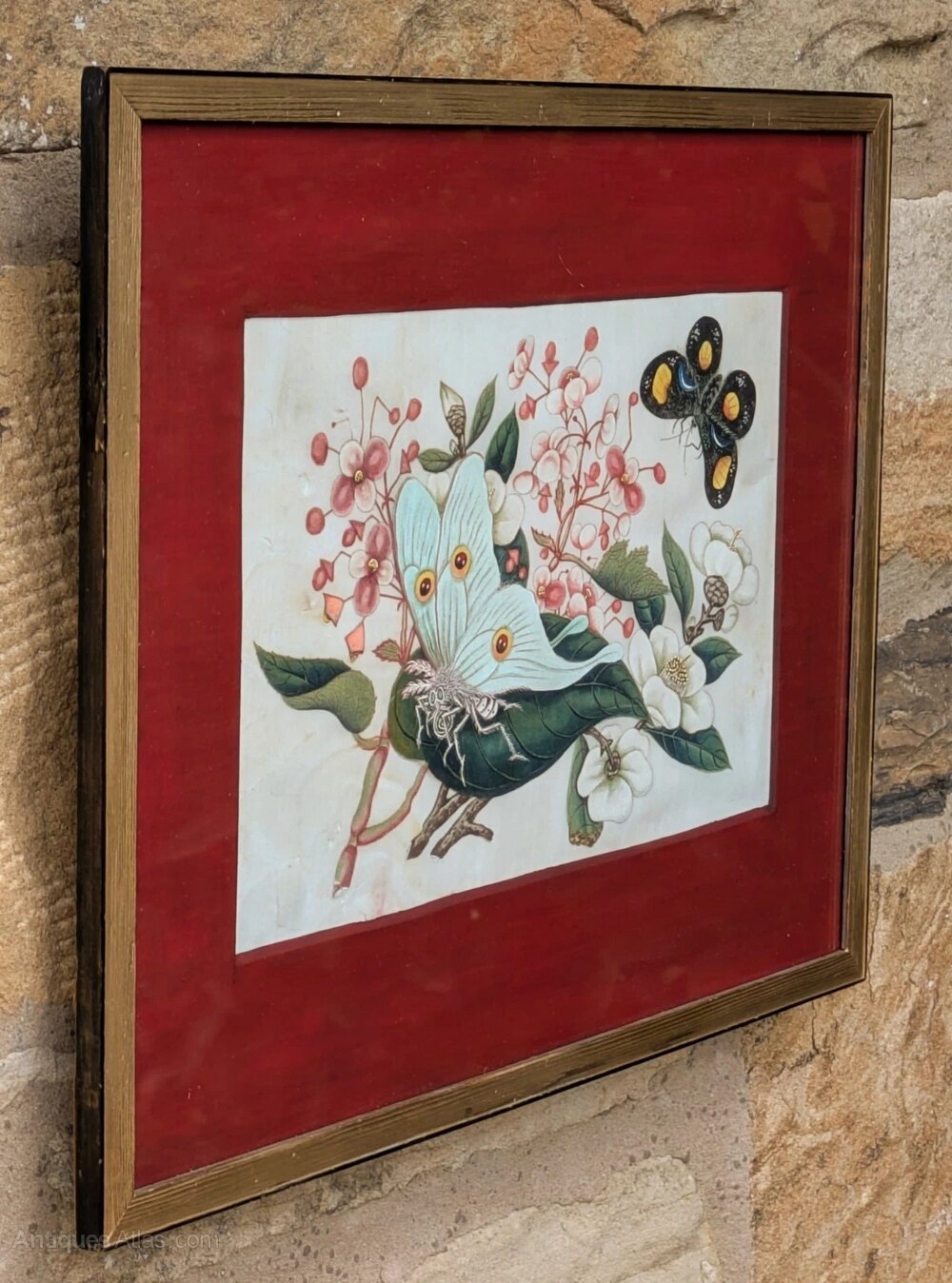 This is a beautiful antique Chinese (Qing) botanical watercolour dating from the mid 19th Century. The well executed painting depicts insects and a butterfly surrounded by native flora.The watercolour is in strong gouache colours on pith and is presented in a neat giltframe with a soft raspberry mount. It is in good condition and measures 36 cms by 28 cms overall including the frame.
