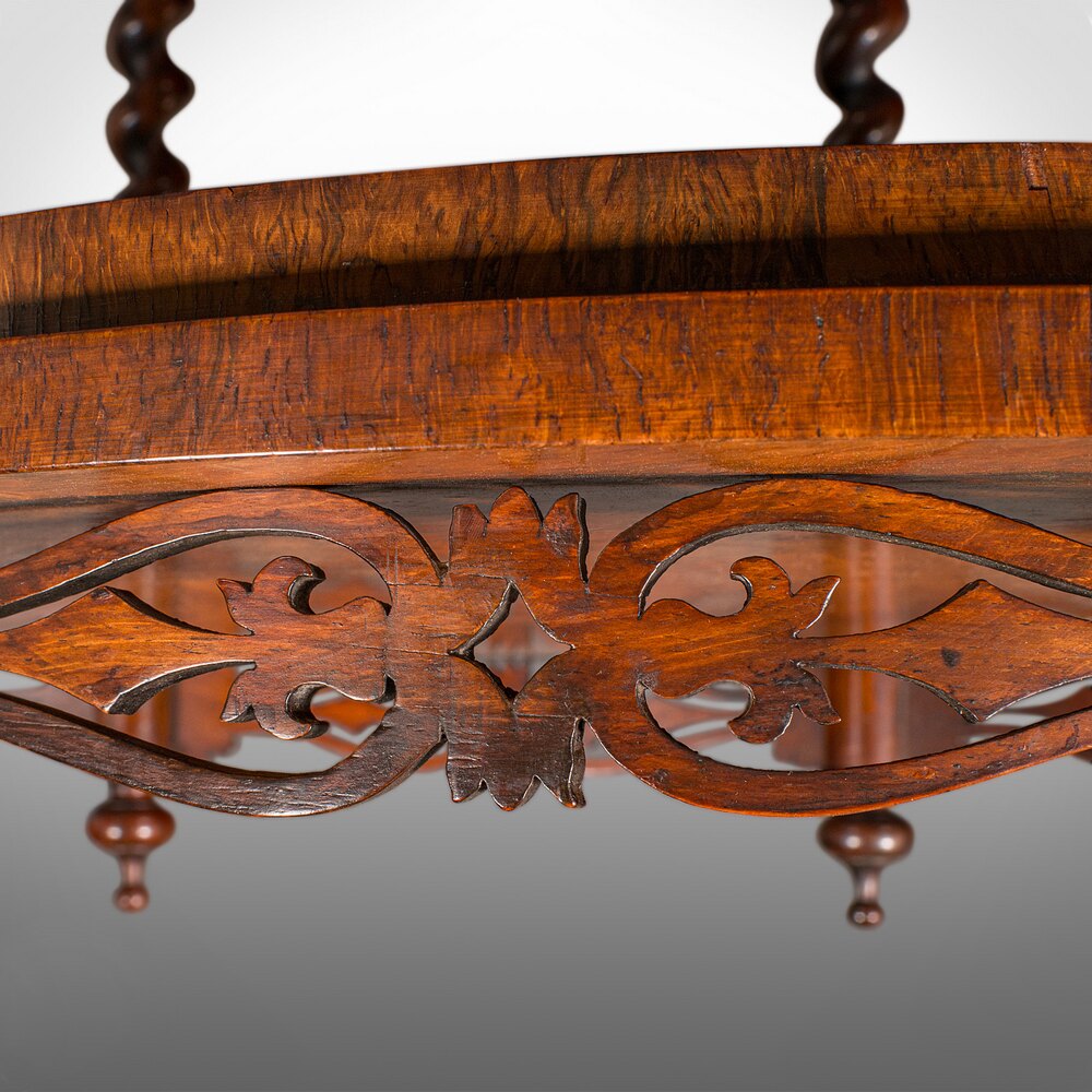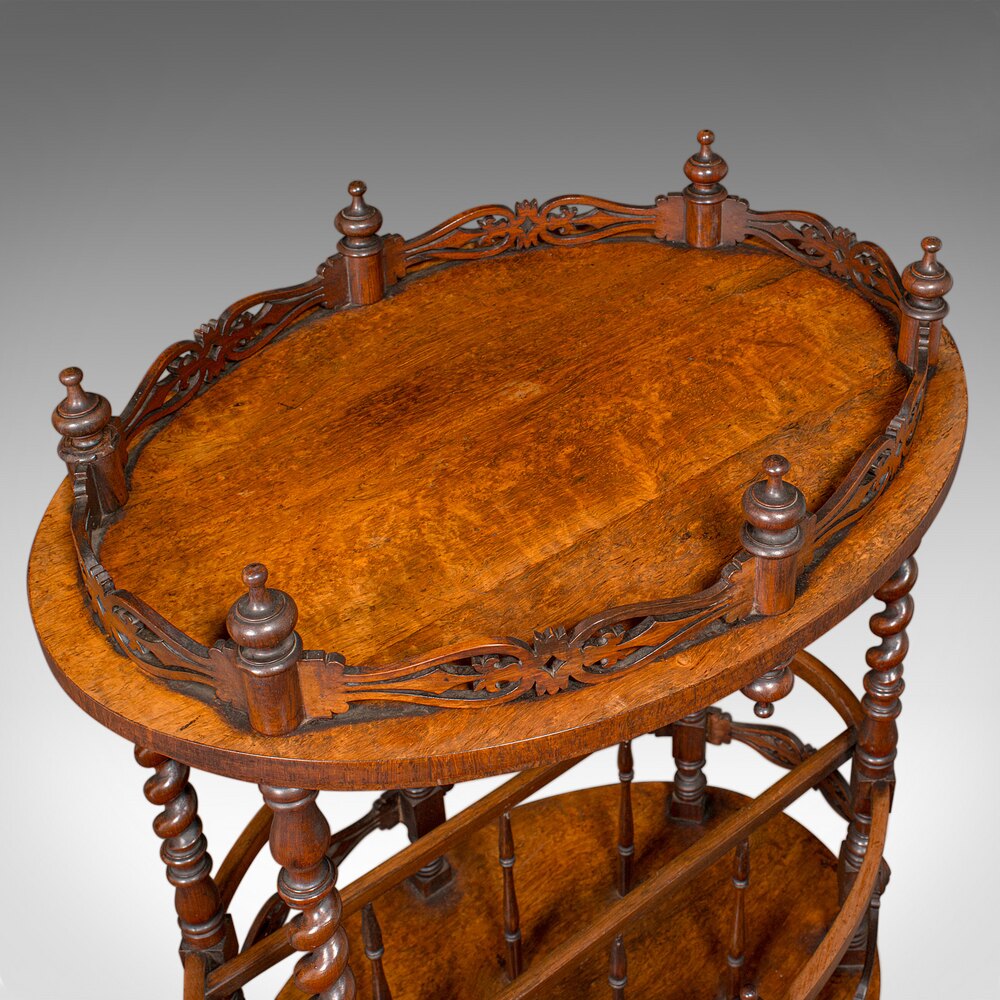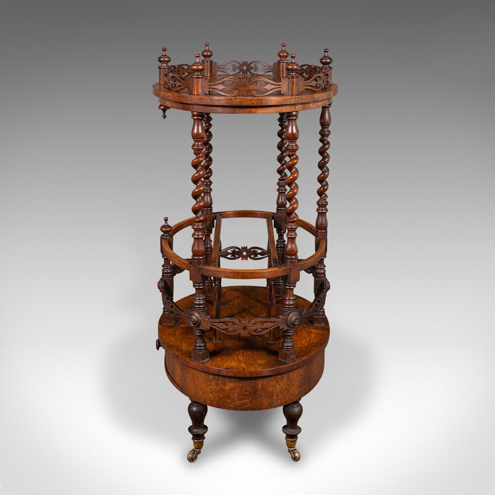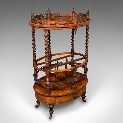 This is an antique cocktail service stand. An English, walnut Canterbury or whatnot, dating to the early Victorian period, circa 1840.