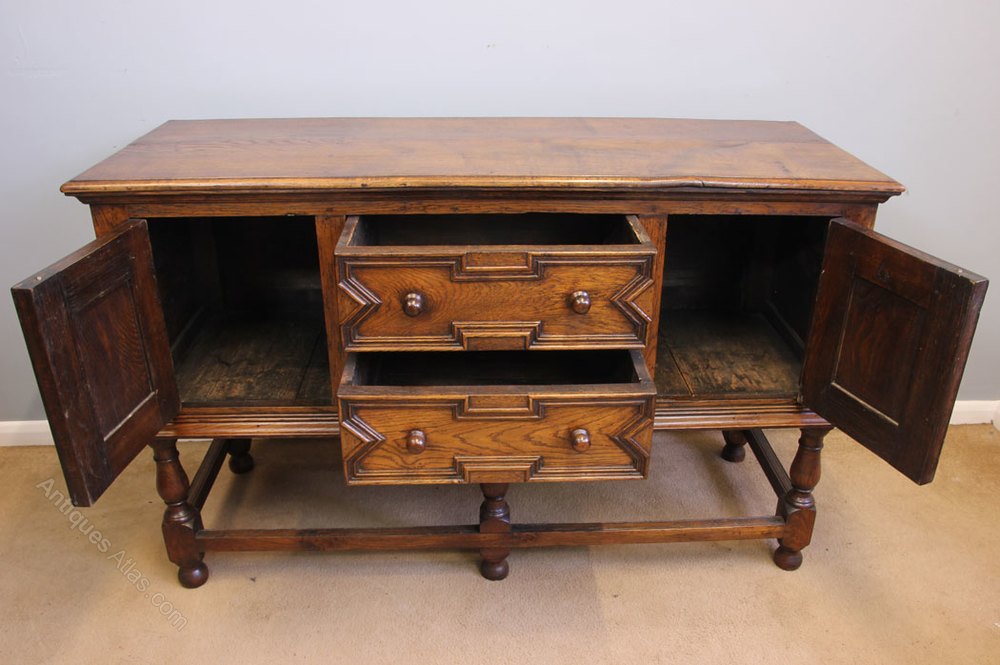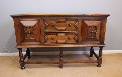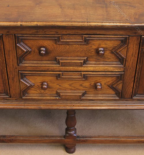 Antique Country Oak Sideboard Dresser Base. This lovely oak dresser base / sideboard has a solid oak top with moulded edge under having two drawers to the centre flanked either side by cupboard the drawer fronts have shaped mouldings and turned wooden handles. The door fronts have raised panel with shaped moulding all supported by turned legs with front and side stretchers.