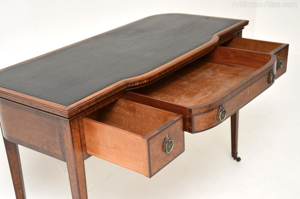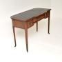 It is of amazing quality and has an absolutely gorgeous design. The top has a breakfront shape with curved back corners, grooved edges and an inset black leather writing surface. There are three drawers with beautiful inlaid designs and brass ring pull handles, the drawers have fine, hand cut dovetailed joints. This stands on finely tapered legs terminating in brass casters, the back is also nicely finished so this can be used as a free standing item.