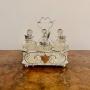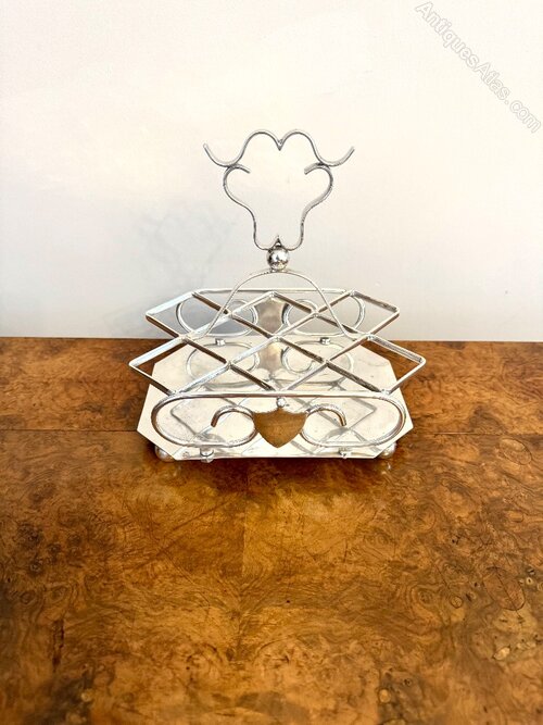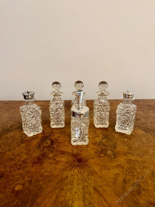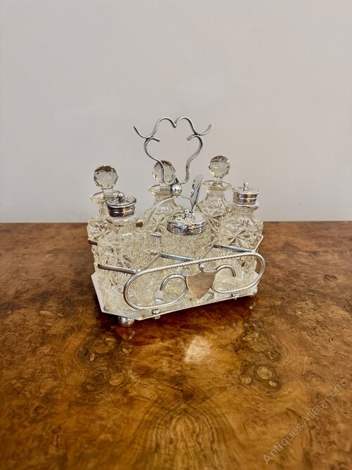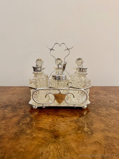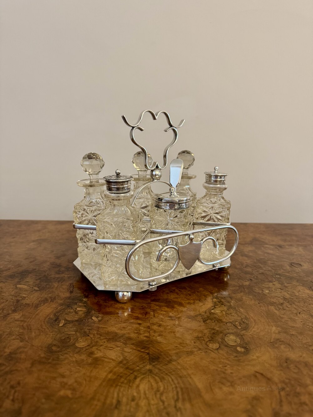 Antique Edwardian silver plated cruet set having a quality silver plated stand with a shaped handle to the middle with six original cut glass bottles three with silver plated tops and three with the original cut glass stoppers, for salt, pepper, vinegar, mustard and oils, raised on bun feet.