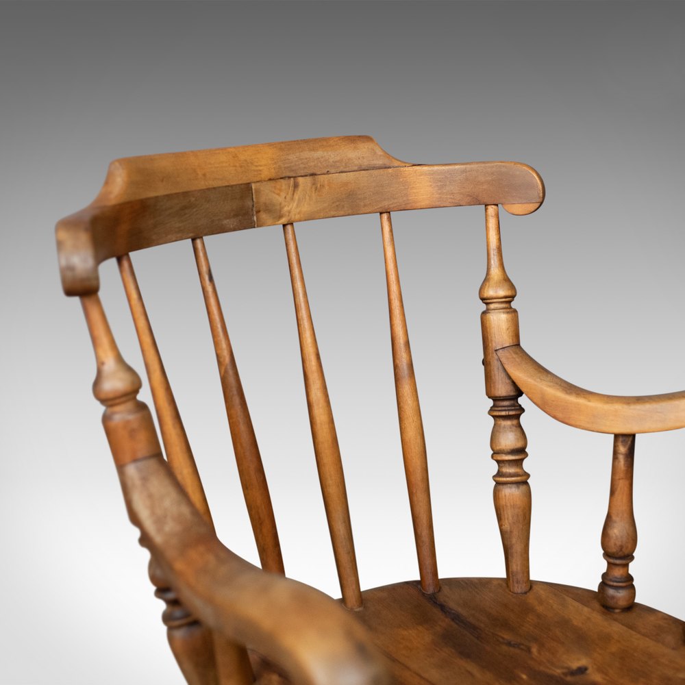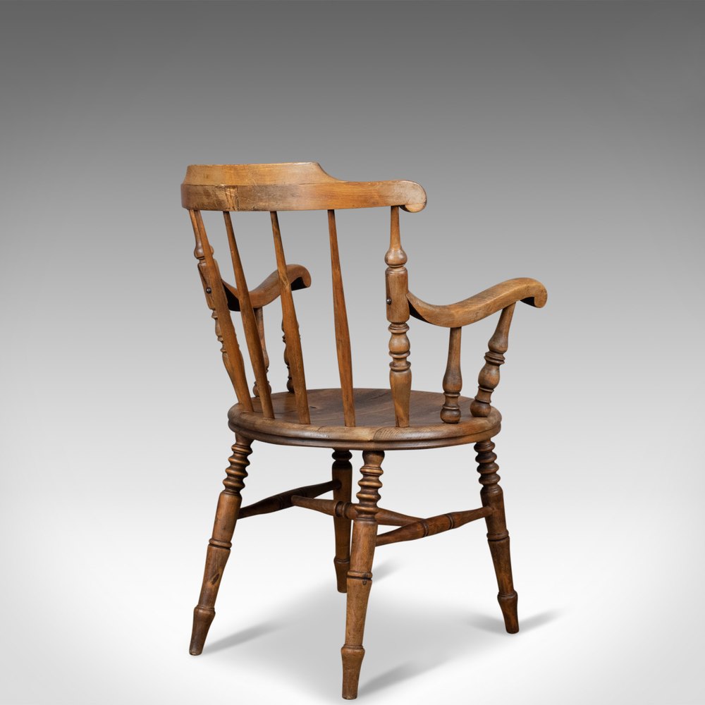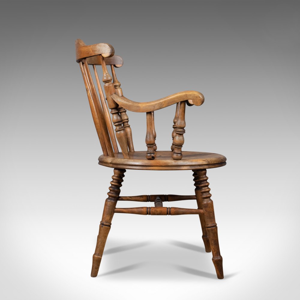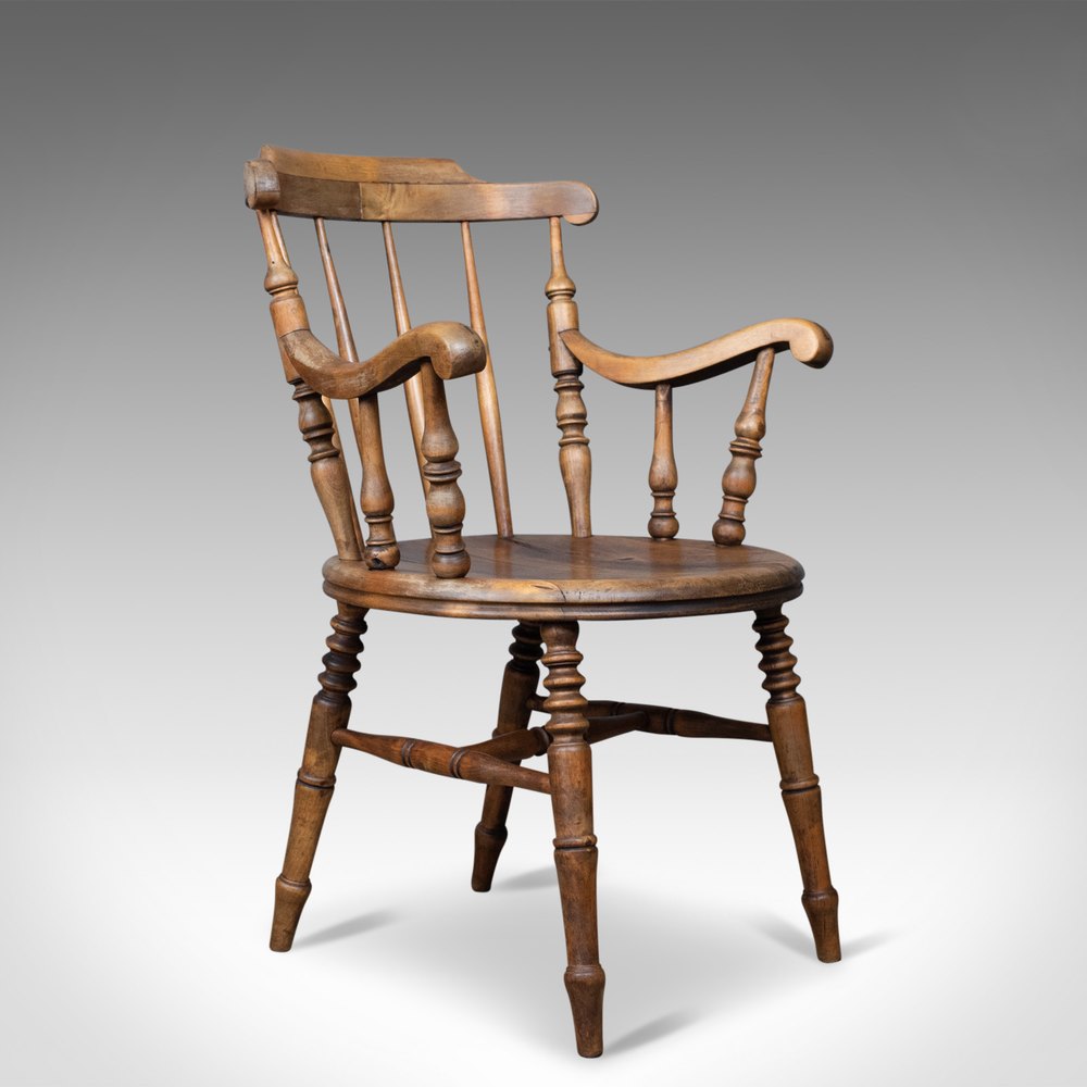 This is an antique elbow chair, an English, Victorian, country kitchen armchair in beech dating to the late 19th century, circa 1900.