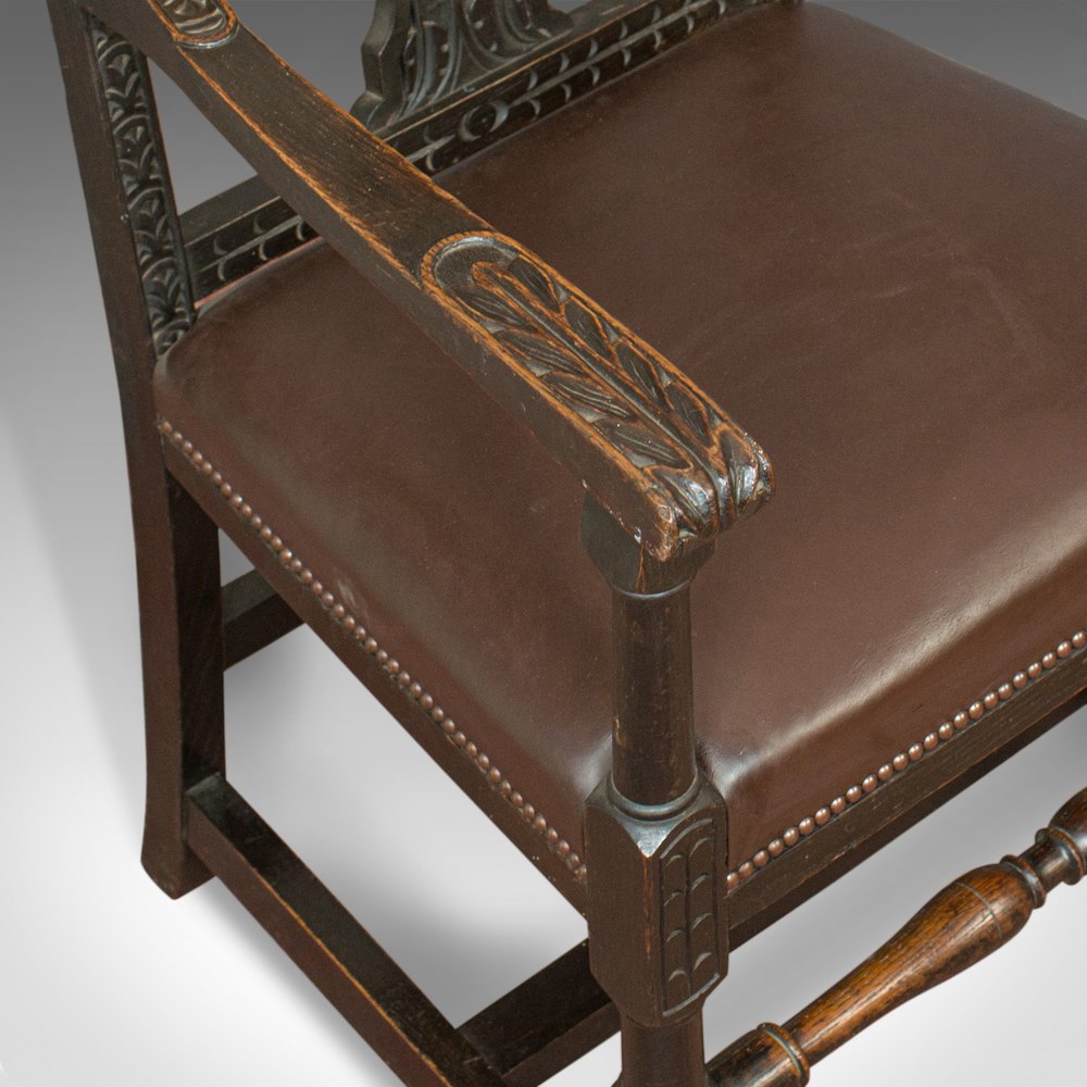 This is an antique elbow chair. An English, Victorian, oak and leather carver armchair dating to the mid-19th century, circa 1870.