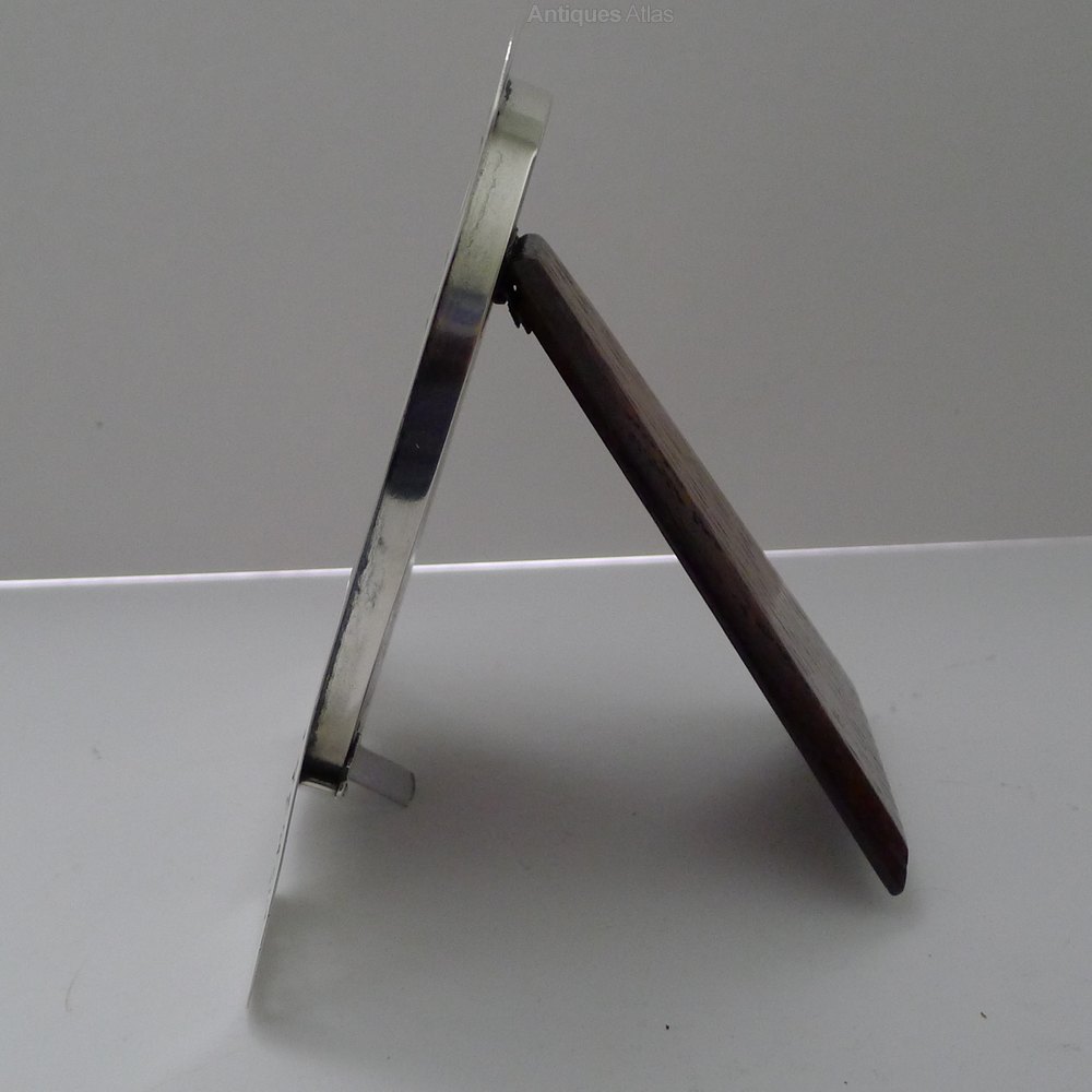 Lovely quality by the top quality silversmith, L Emmanuel. The full hallmark can be found on the back of the silver for Birmingham 1916. The back is made from solid English Oak with an integral folding easel stand.