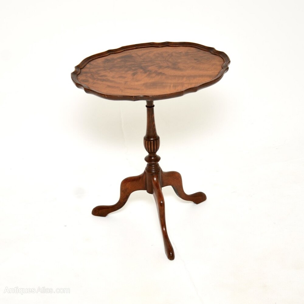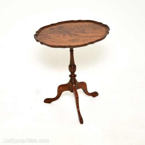 It is of lovely quality and is a very useful size. The oval top has a raised pie crust edge and stunning figured walnut grain patterns. It sits on a finely constructed tripod base.