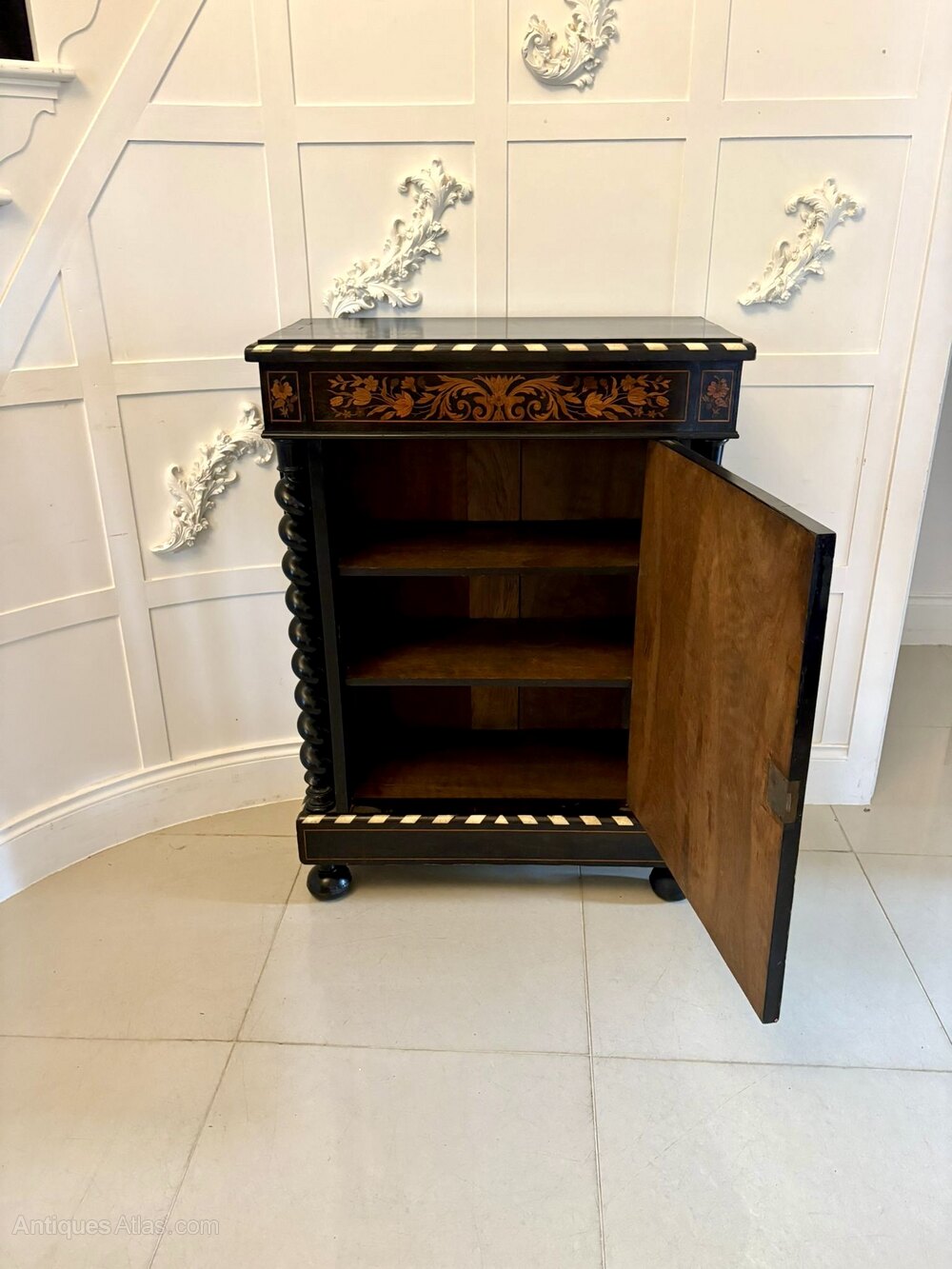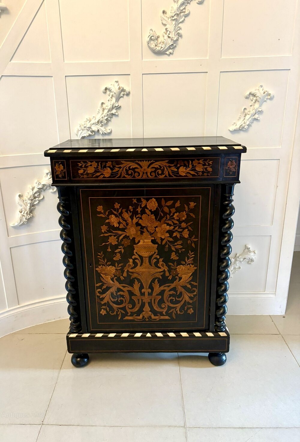 Outstanding quality antique Victorian floral marquetry and ebonised side cabinet having an ebonised top above a floral marquetry frieze above a spectacular quality floral marquetry single door opening to reveal a shelf interior flanked by ebonised barley twist columns standing on a plinth base with original turned feet.