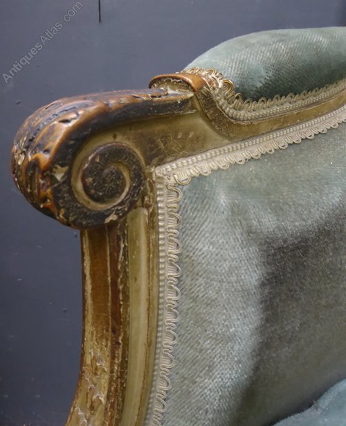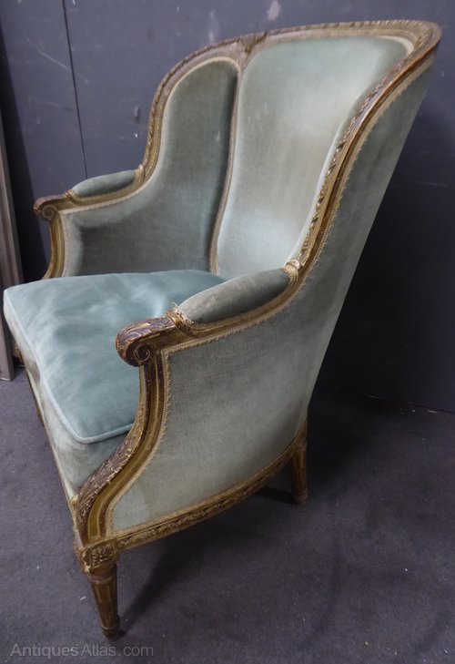 Ref 7653 - Antique French carved walnut bergere armchair. Old velvet covering. Circa 1900.