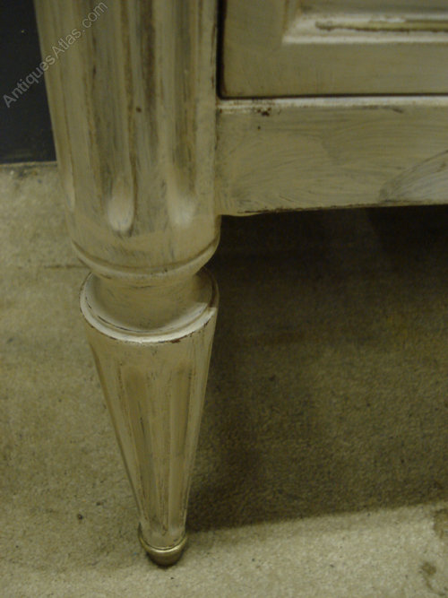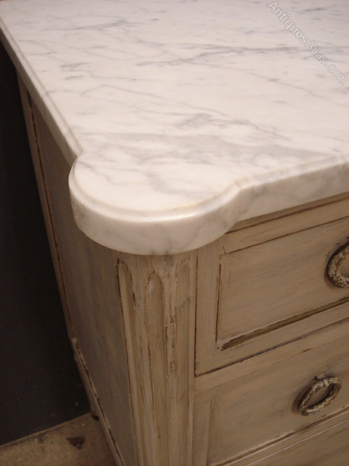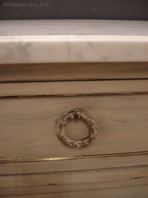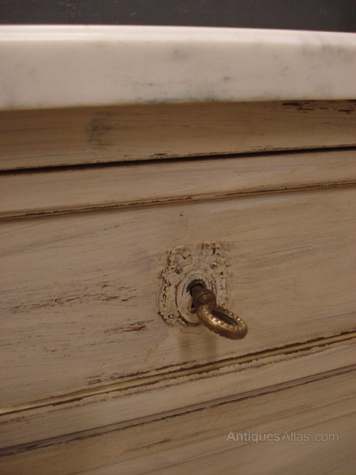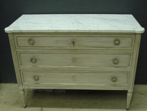 Ref 4691 - Louis XVI style worn pale grey painted 3 drawer commode. Original white/grey figured marble top. Original metal fittings. Top drawer with working lock. Circa 1950.