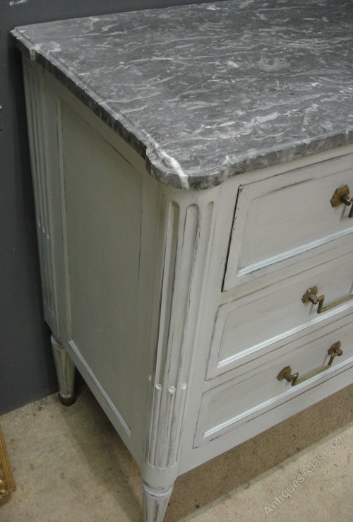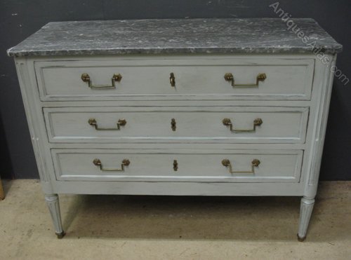 Ref 6242 - Antique French Commode - 19th Century worn grey painted three drawer commode. Original grey figured shaped marble top. Original brass fittings and working locks. Circa 1880.