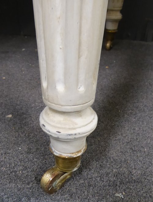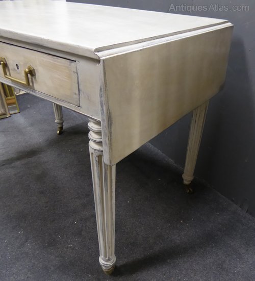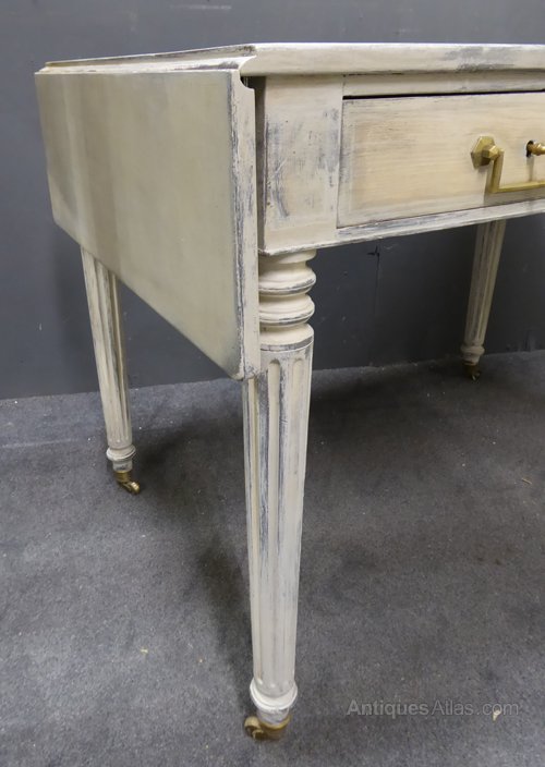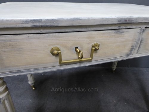 Ref 6625 - 19th Century Antique French worn grey painted desk with folding leaves. Two drawers with original working locks. Dummy drawer fronts on other side. Original brass castors. Circa 1880.