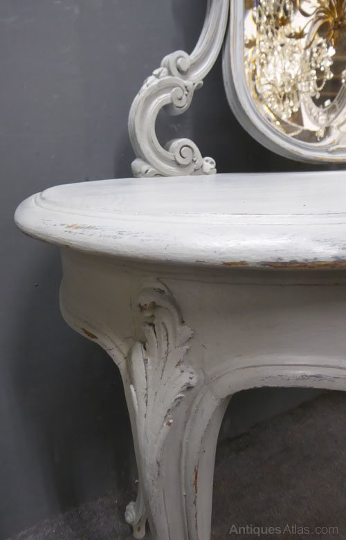 Ref 7392 - Worn grey painted carved wood Louis XV style kidney shaped antique French dressing table with single drawer. Mirror with original bevelled glass. Circa 1900.