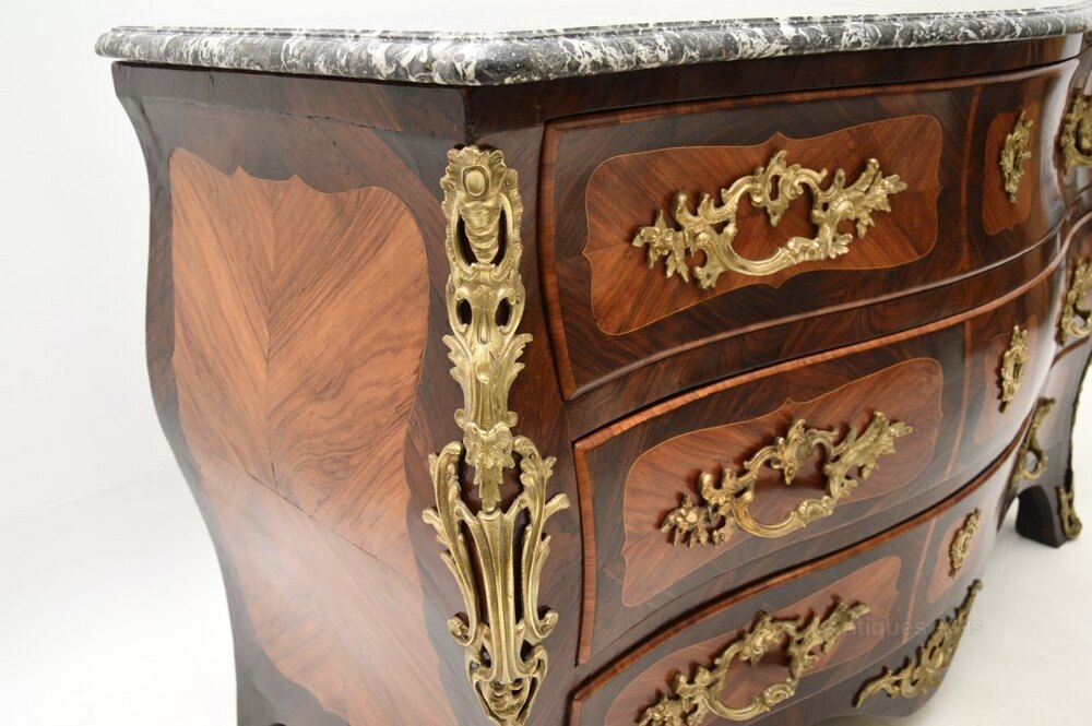 It is of magnificent quality with a beautiful design and generous proportions. There is stunning inlaid marquetry of various woods and extremely high quality gilt bronze mounts all over. This has a curvaceous bombe shape with a serpentine front edge. The marble top is likely original, it is very thick and is a lovely speckled grey.