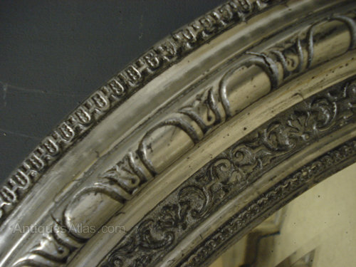 Ref 4986 - Antique French Mirror - Large landscape double crested antique oval mirror finished in silver on black. Original bevelled glass. Original pine board back. Circa 1890.