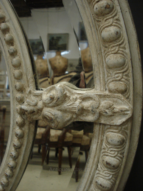 Ref 5019 - Antique French Mirror - Large landscape worn white painted crested oval margin mirror with gesso decorated frame. Original bevelled glass with one replaced piece to bottom right margin. Some fine surface scratches to right side of centre plate. Original pine board back. Circa 1890.