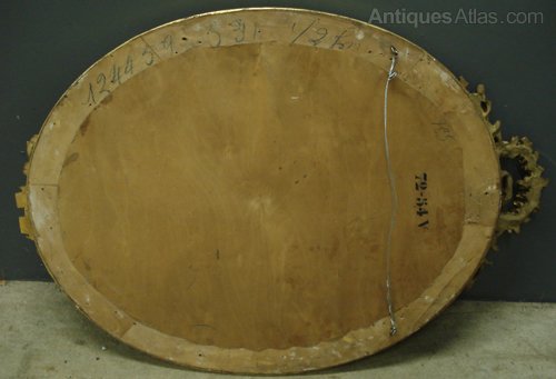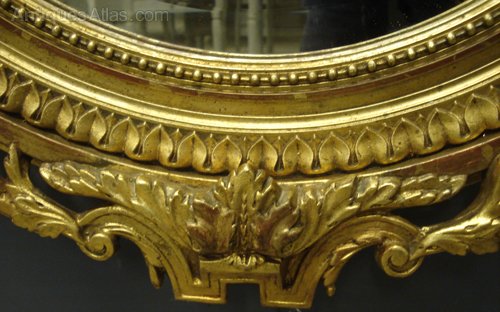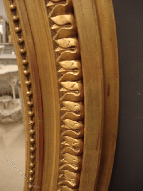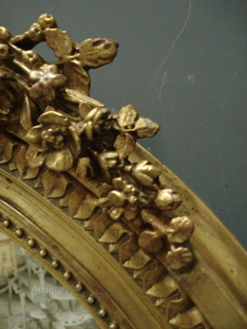 Ref 5421 - Antique French Mirror - Double crested original two tone gilt on red oval mirror with gesso decoration to frame. Original bevelled glass. Original thin veneer back. Circa 1890.