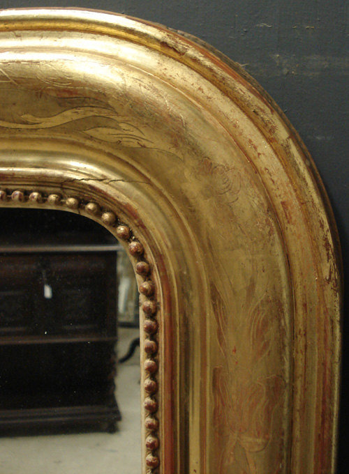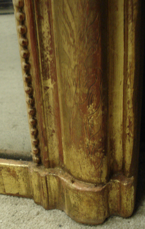 Ref 3756 - Antique French Mirror - Period gilt on red Louis Philippe overmantle mirror with flower and leaf decoration to frame. Original mercury glass with some small patination marks. Original panelled back. Circa 1840.