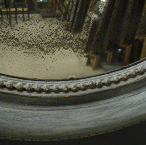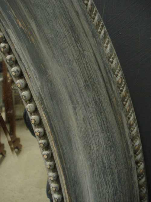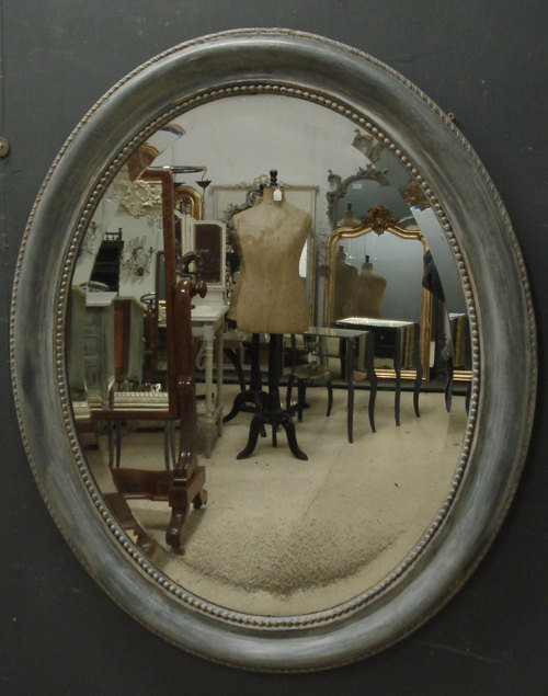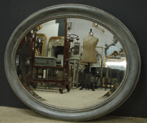 Ref 3654 - Antique French Mirror - Large landscape/portrait period Louis Philippe oval mirror. Finished in worn pale grey paint. Original patinated bevelled mercury glass. Original pine board back. Circa 1840.