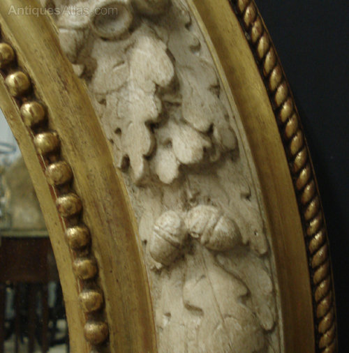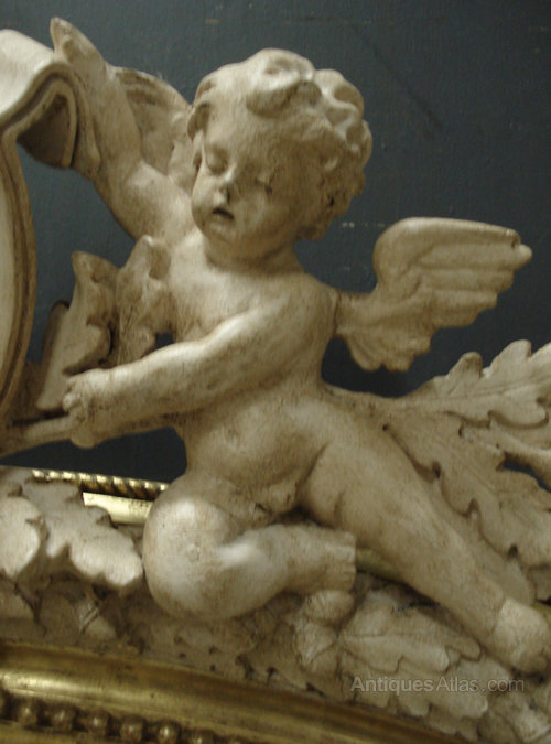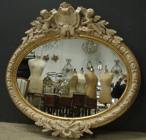 Ref 3930 - Antique French Mirror - Cherub crested landscape oval mirror with oak leaf and acorn decoration to frame. Finished in gilt on red and polished off white painted decoration. Original glass. Replaced back. Circa 1880.