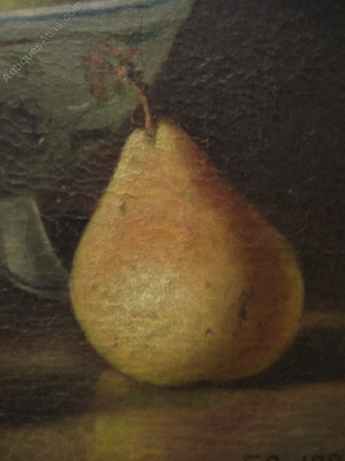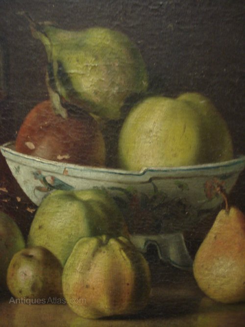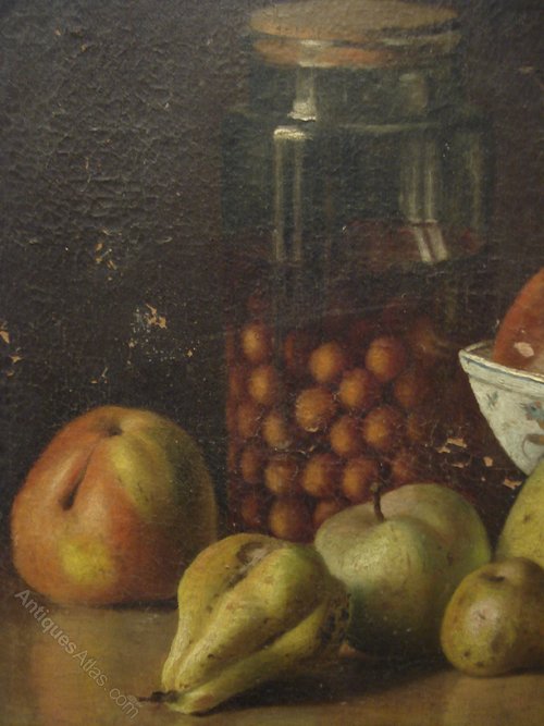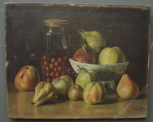 Ref 6153 - 19th Century oil on canvas in original, unrestored condition. Still life - Fruit. Initialled and dated 1889.