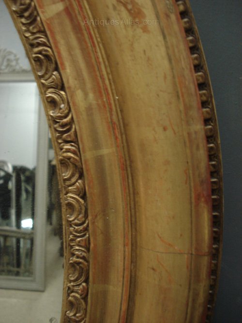 Ref 5346 - Antique French Mirror - Gilt on red Louis Philippe oval mirror with gesso decoration to inner frame. Original mercury glass with some small patinated areas. Later newspaper and cardboard back. Circa 1840.