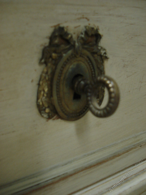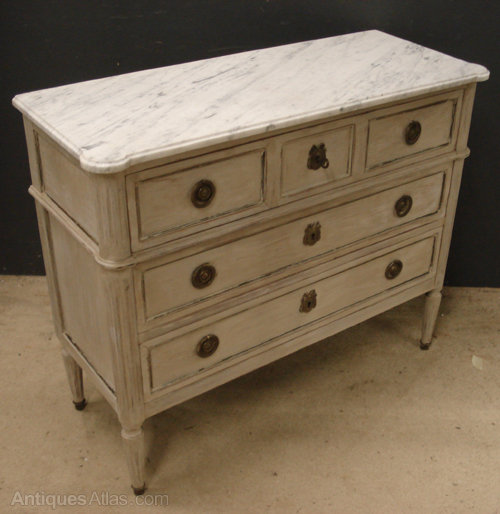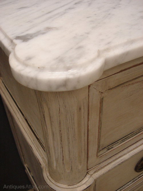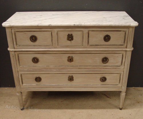Ref 4054 - Louis XVI style distressed painted 3 drawer commode. Original marble top. Original brass fittings. Circa 1950.