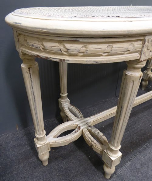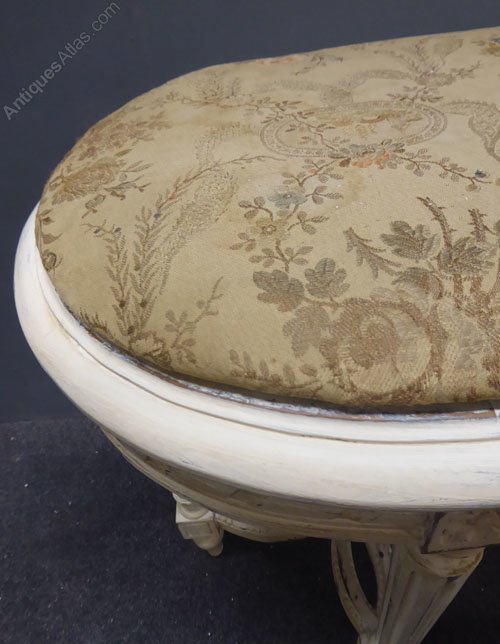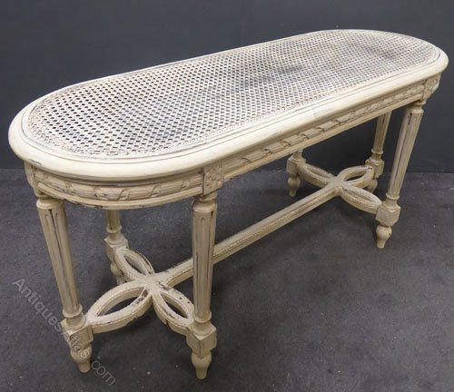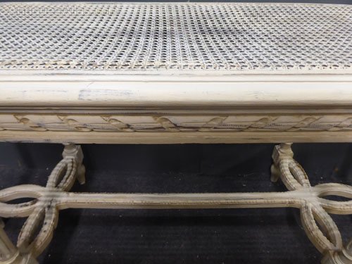 Ref 7410 - Worn cream painted carved wood antique French stool with cane top and loose upholstered cushion. Circa 1900.
