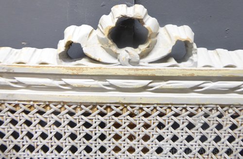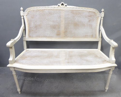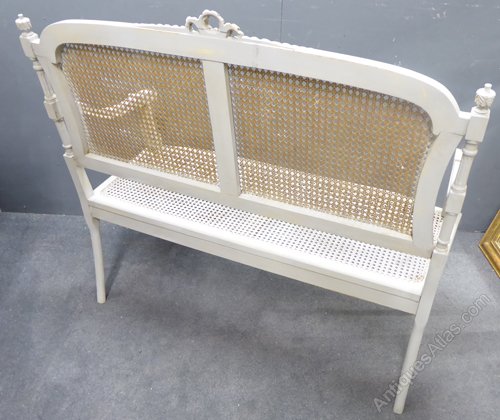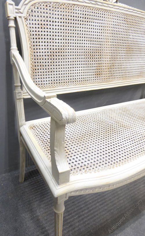 Ref 7140 - Antique French worn grey painted Louis XVI style sofa with cane panels. One small repair to cane seat panel. Circa 1900.