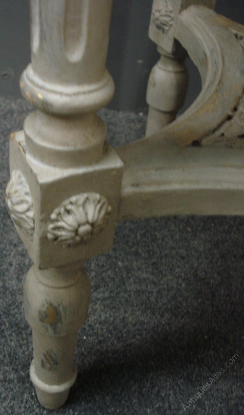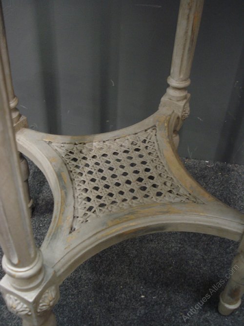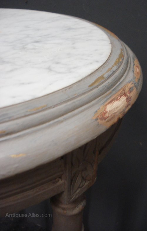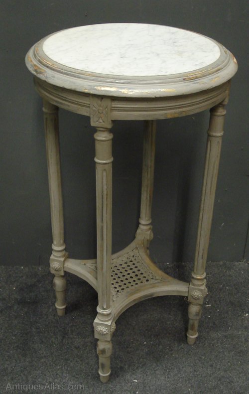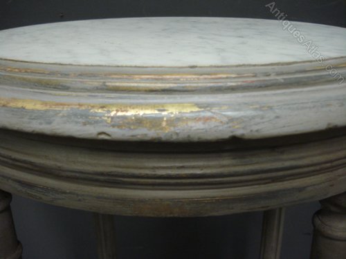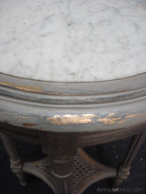 Ref 6541 - Worn grey painted round side table with cane panel and white/grey figured marble top. Circa 1900.