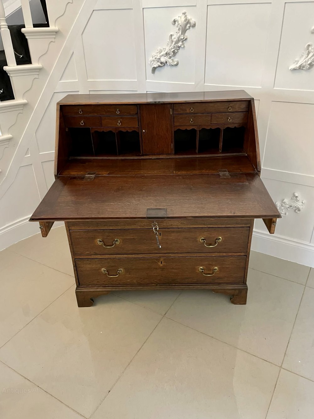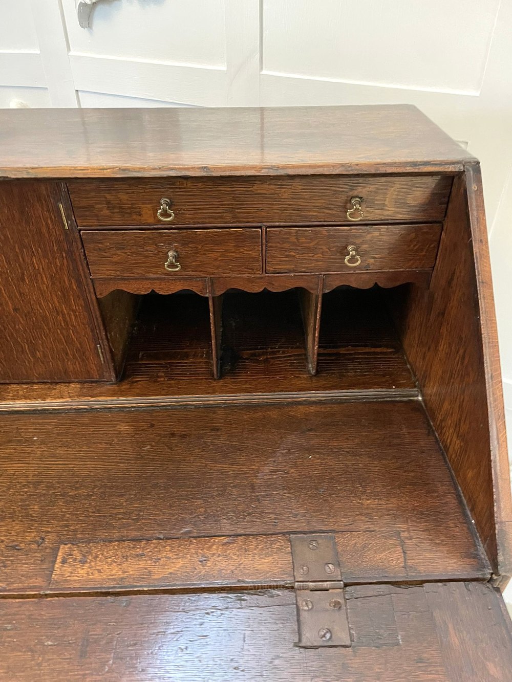 Antique George III quality oak bureau having a quality oak fall opening to reveal a fitted interior consisting of six small drawers with original brass handles, six pigeon holes and a centre door