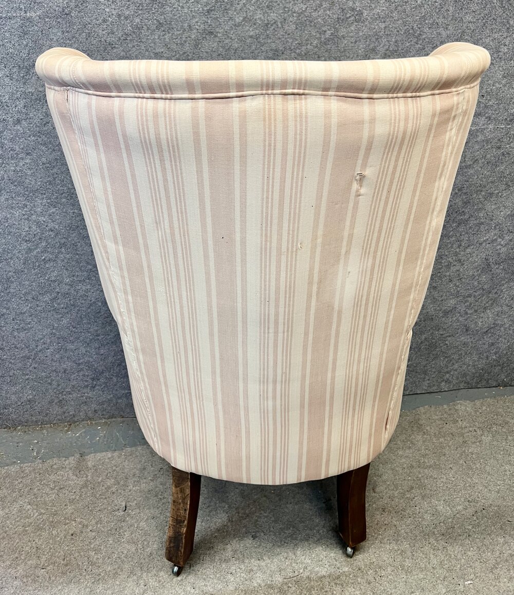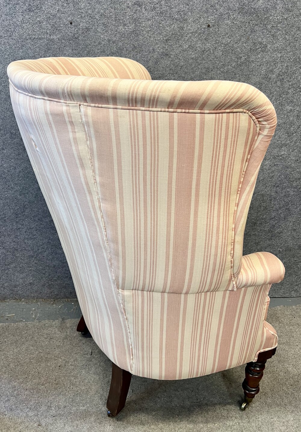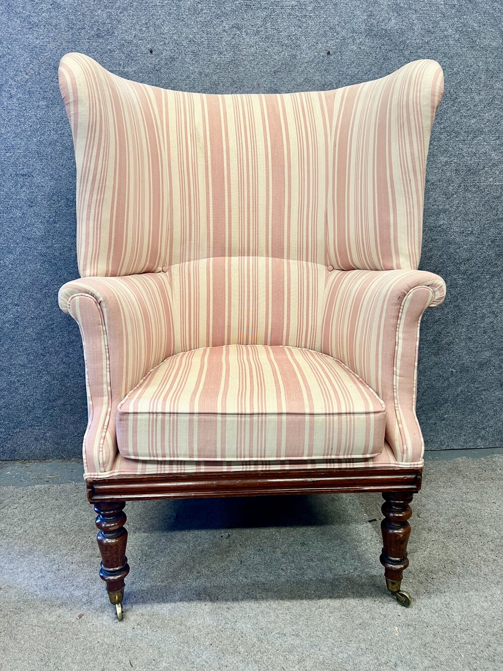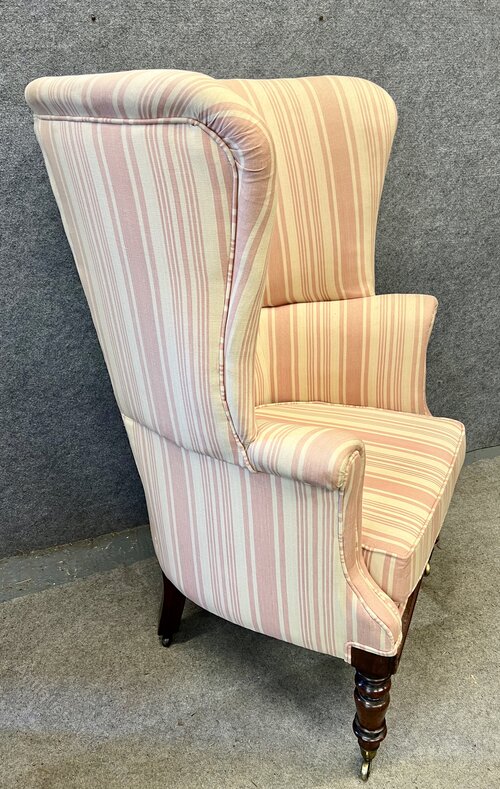 A George IV barrel back porters chair. The wrap around back joining roll over arms and loose cushion. The mahogany moulded frieze supported on turned and tapering legs with brass cup casters and out-swept legs to the back. The upholstery is very clean with one small flaw to the outback (see photo). Dimensions:- Height…45’’/ 114cm. Width…30.25’’/ 77cm. Depth…29’’/ 73.5cm. Seat Height…18.5’’/ 47cm. Delivery to most of U.K. mainland £50