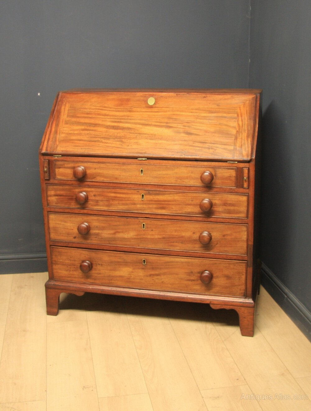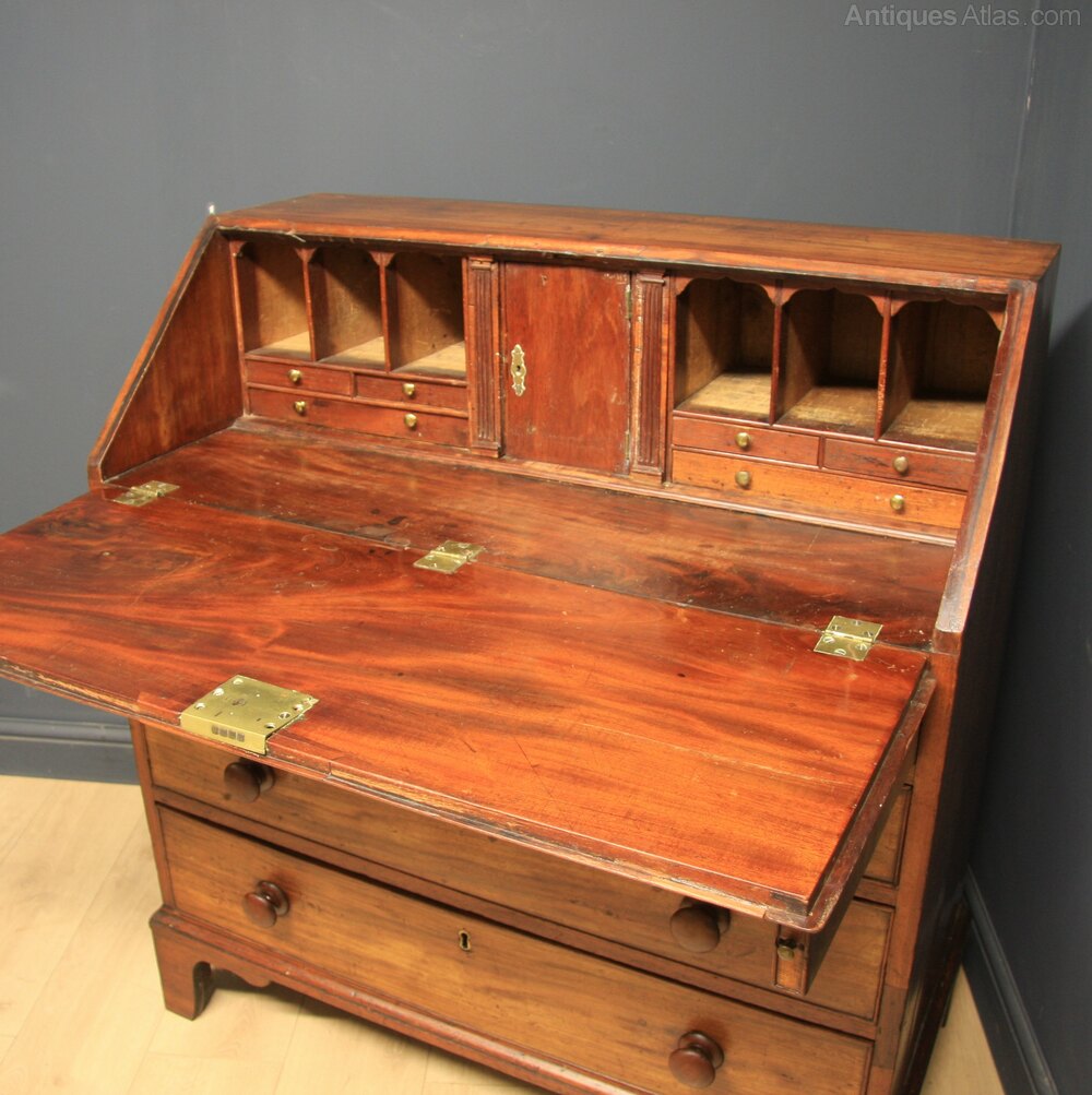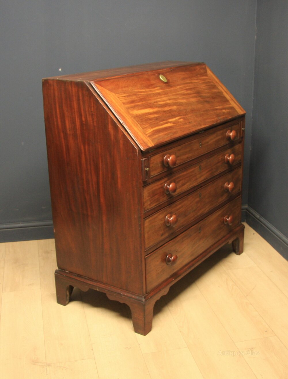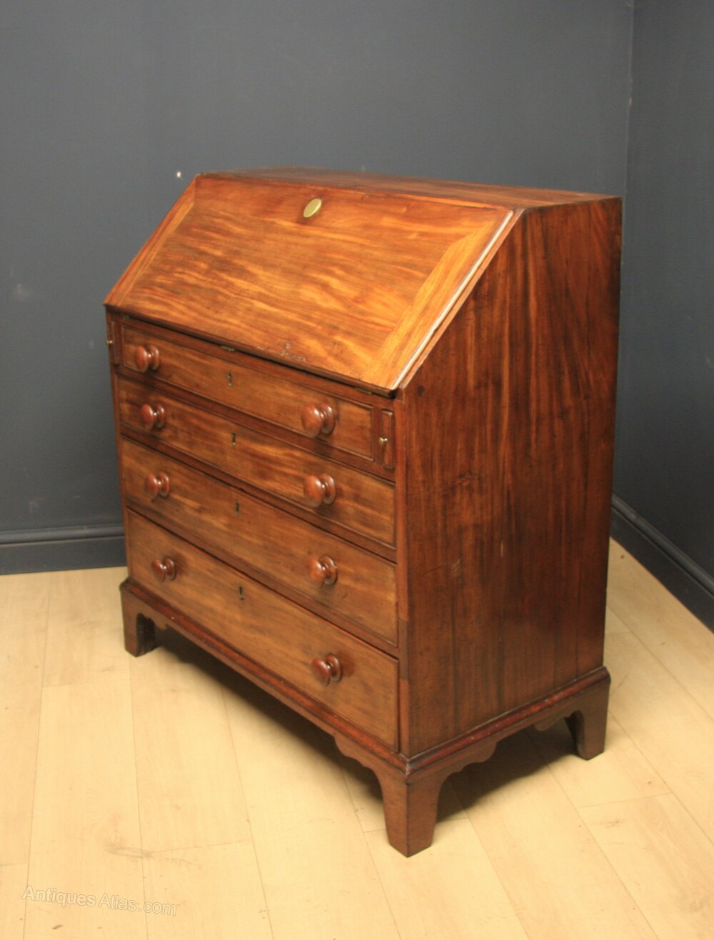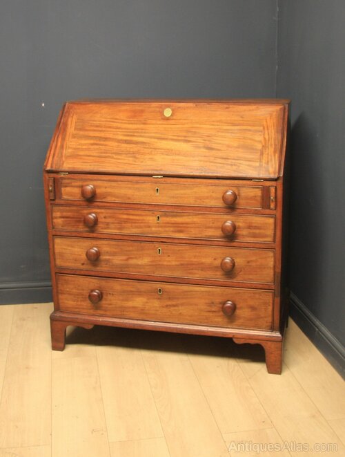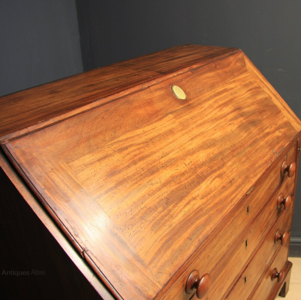 Georgian mahogany bureau having figured fall front that opens to reveal writing surface with pigeon holes and small drawers over 4 long graduated drawers all standing on bracket feet.