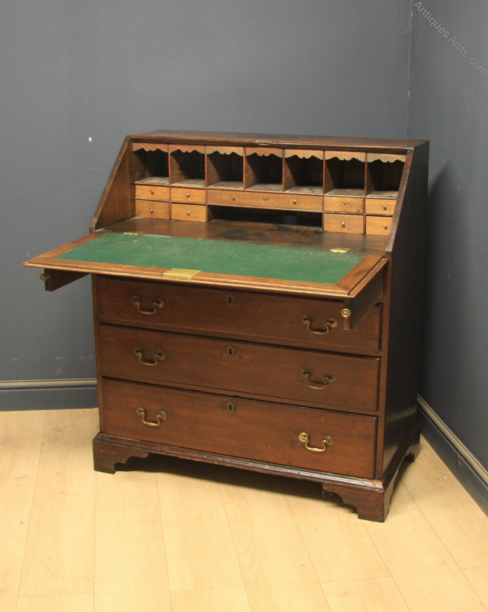 Good quality Georgian oak bureau having figured fold down front that opens to reveal leather writing surface and small drawers and pigeon holes over 4 long graduated drawers with swan neck brass handles all standing on bracket feet.