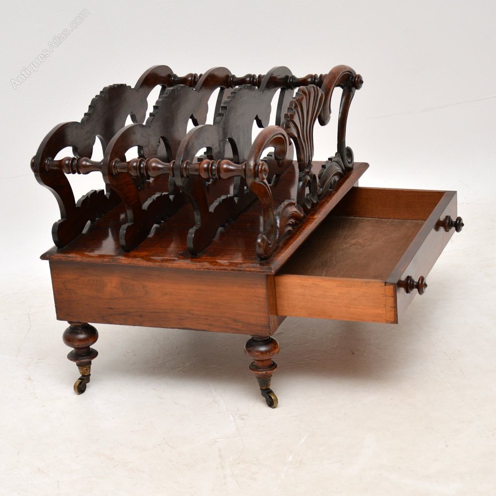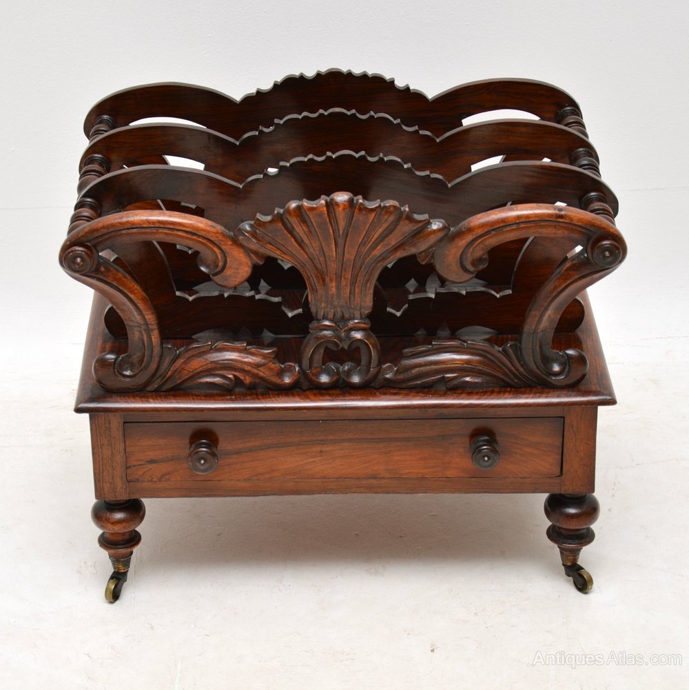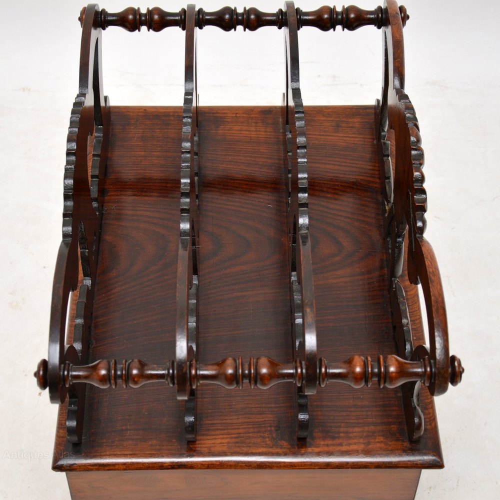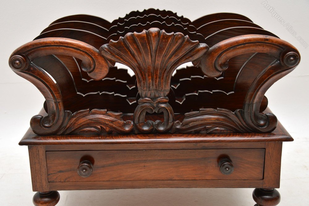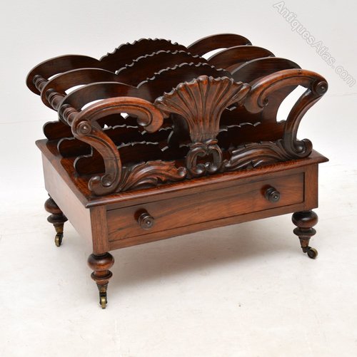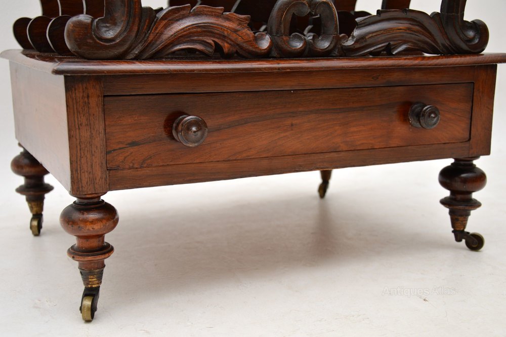 Antique late Regency rosewood Canterbury in good original condition & dating to around the 1830-40’s period. This is a very useful & top quality item, that’s perfect for holding magazines. It’s beautifully carved on the front & there are four partitions. There’s a drawer below & it sits on turned legs with original brass cupped casters. There is an old repair with a metal bracket showing inside one of the partitions which we have shown in one of the images. I think it’s best to leave as is, because it must have ben done along time ago & it all part of the character.