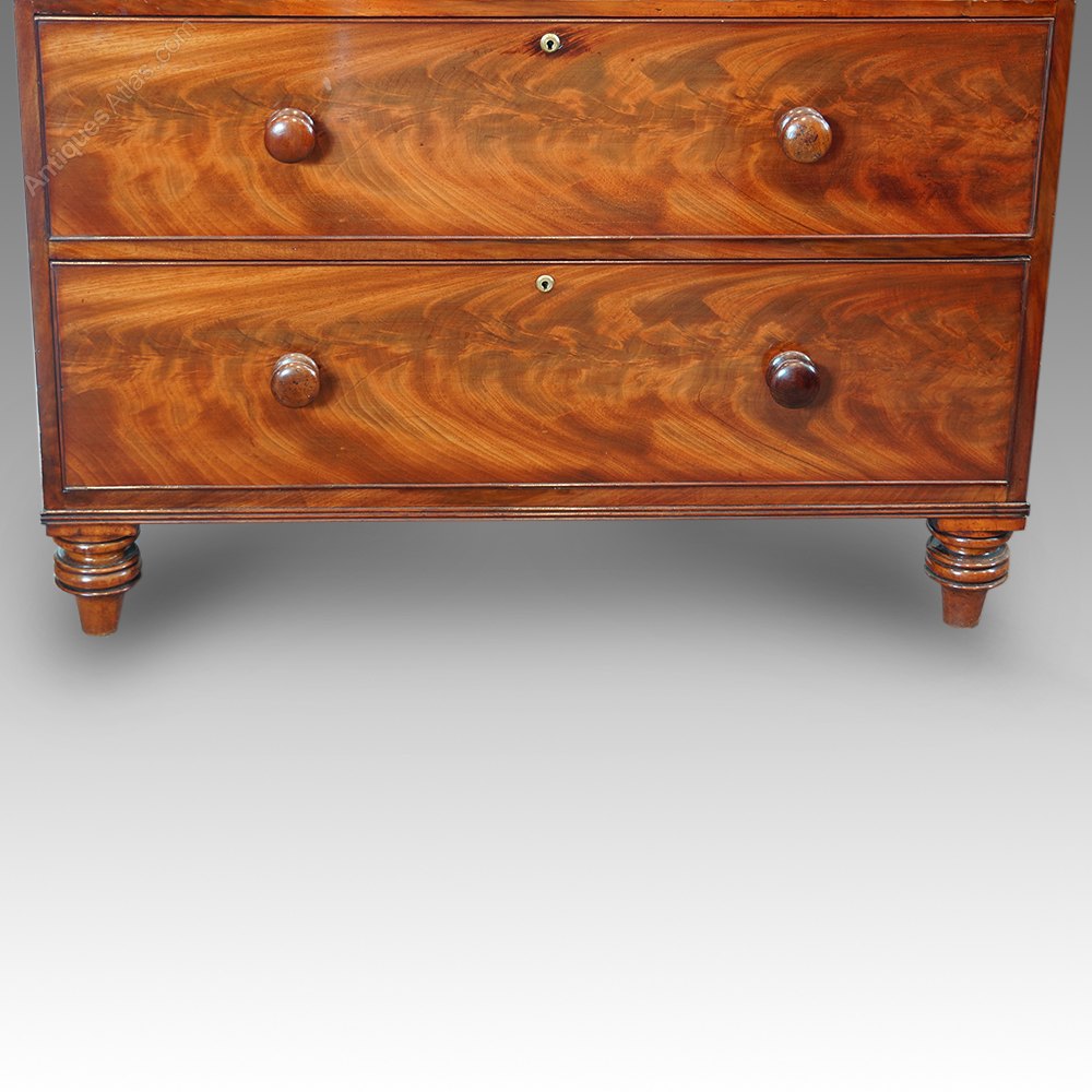 Having magnificent flame mahogany to the drawer fronts and then the highly fashionable turned mahogany feet and knob handles.
