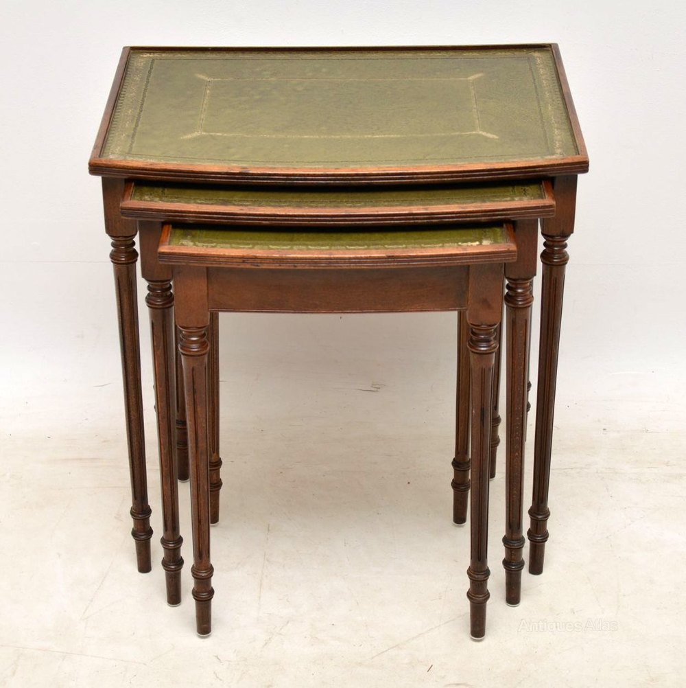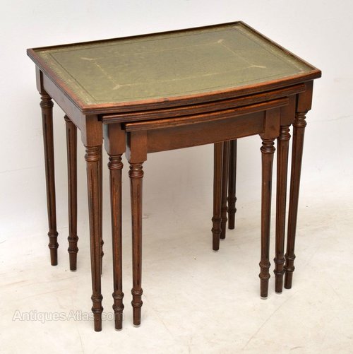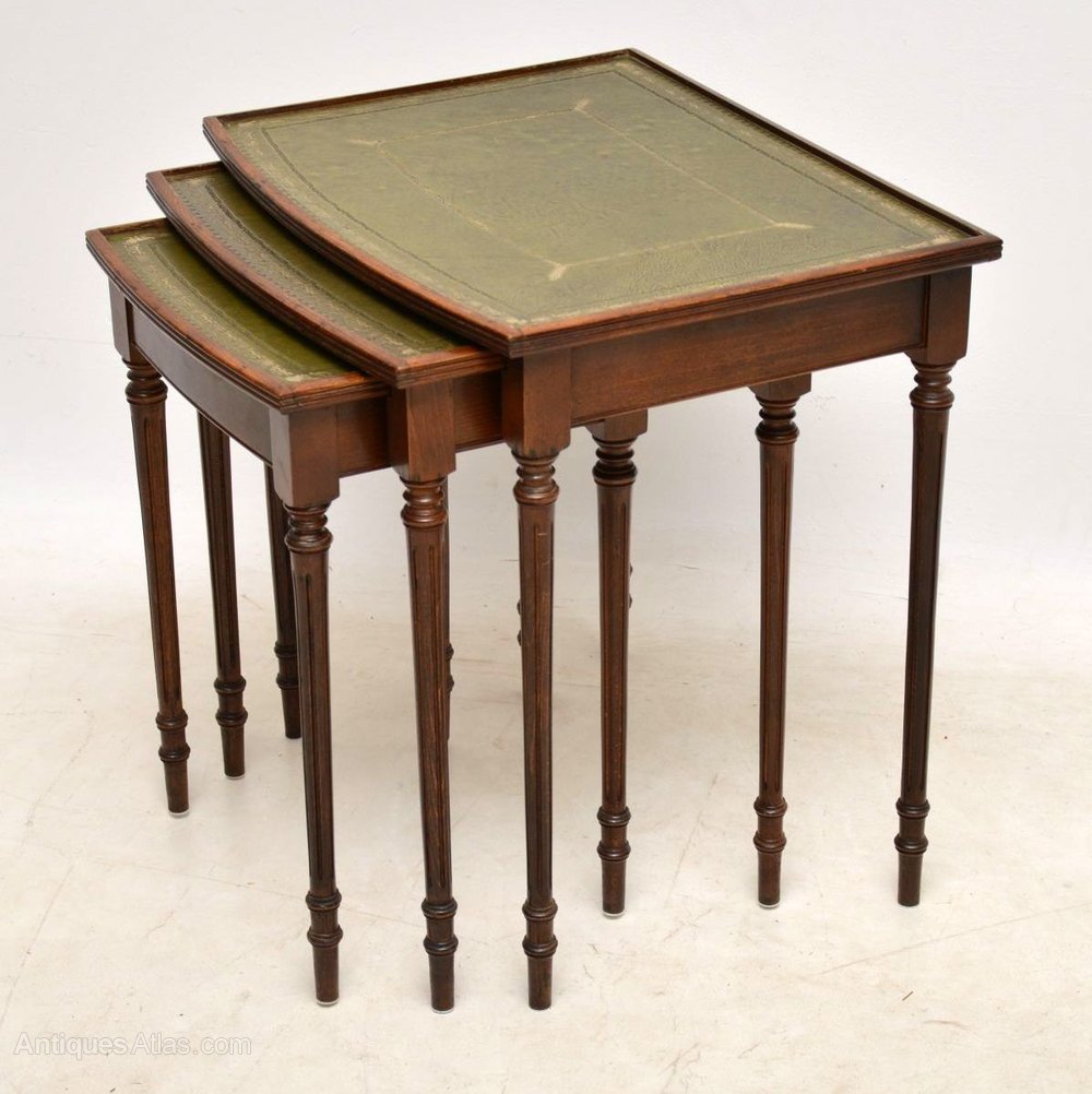 Antique Georgian style mahogany nest of antique tables with tooled leather tops, reeded edges & turned fluted legs. They are in good original condition & date from around the 1950’s period.