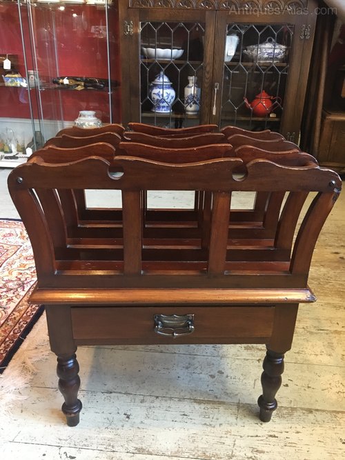 Nice quality antique canterbury in mahogany with broken swan neck design to the top and a lower drawer that opens with a brass handle.
