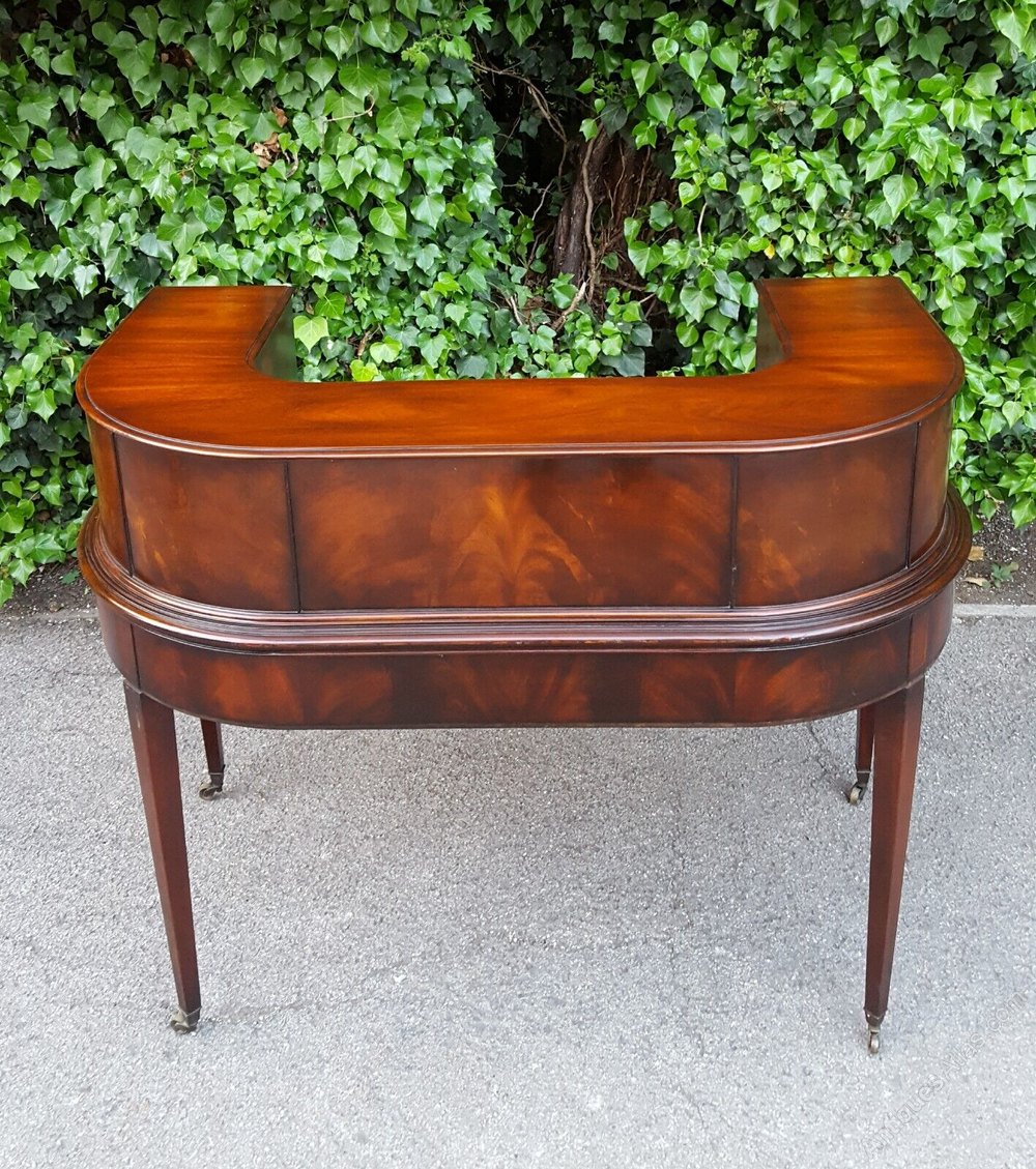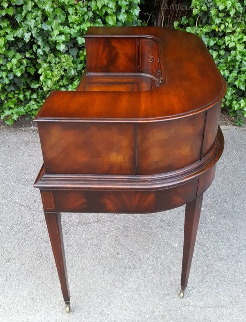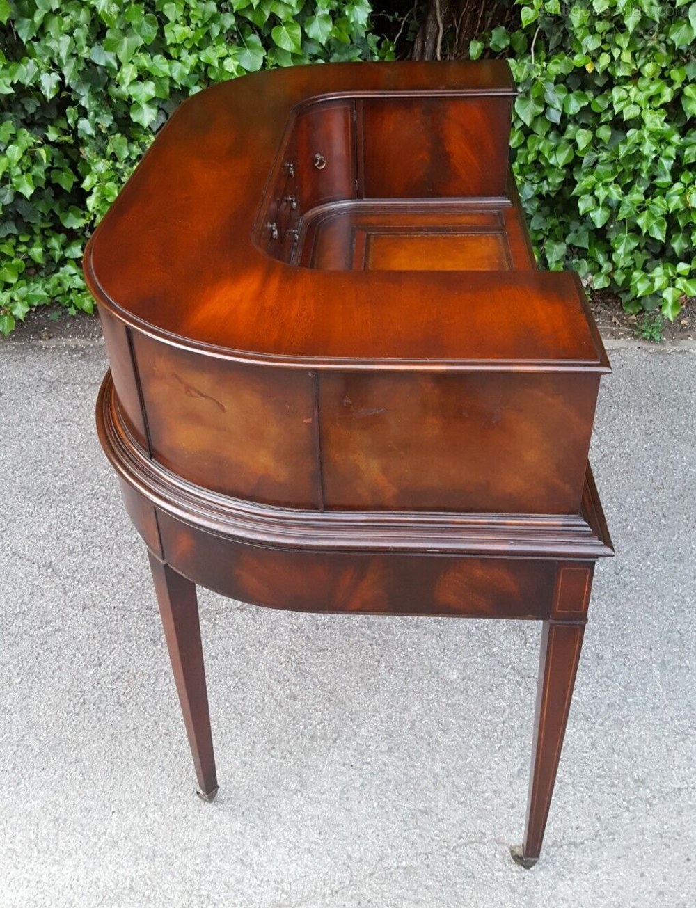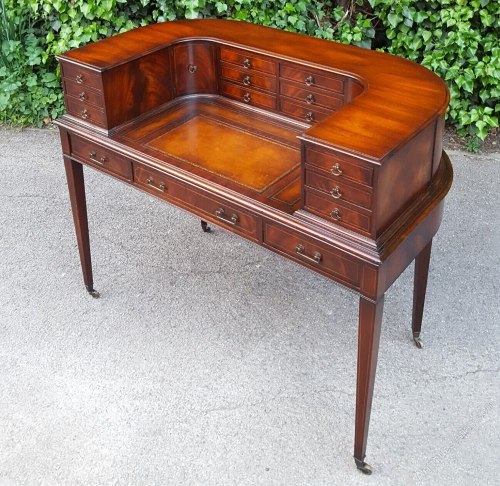 Offered For Sale Is This Antique Style Mahogany Carlton House Desk, item has a total of 15 drawers & 2 small doors, with a brown hide leather writing surface.
