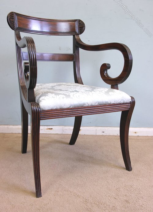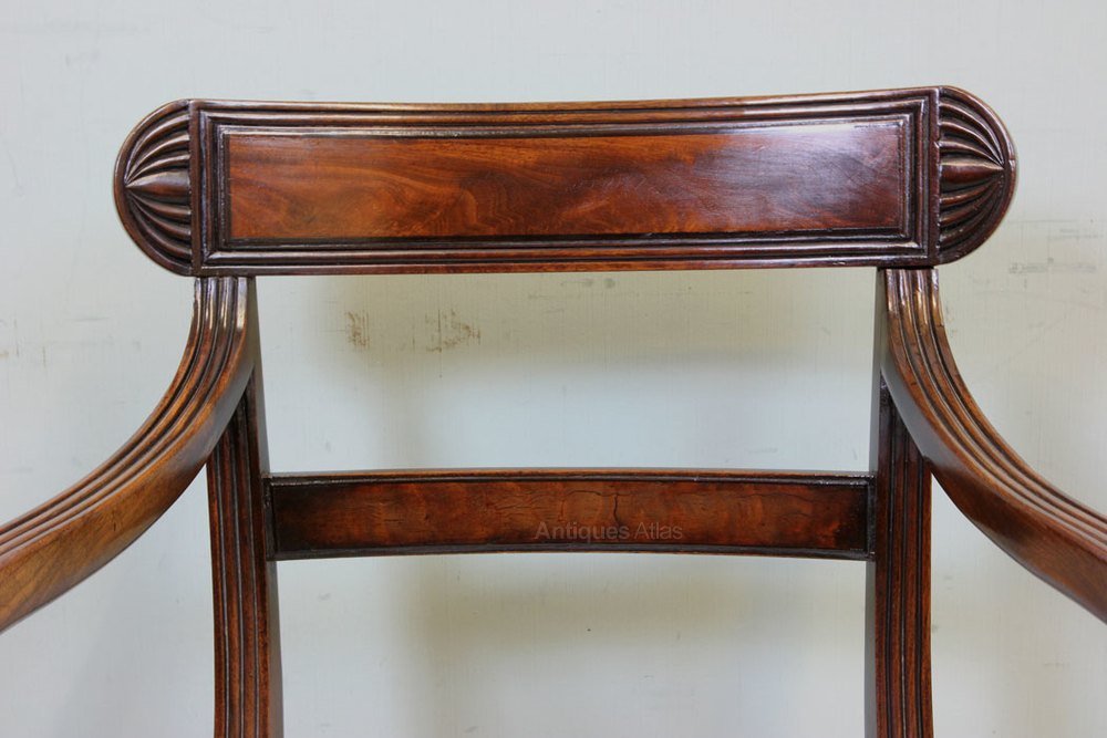 Antique Mahogany Desk Carver Armchair. This wonderful mahogany carver / desk / armchair has a lovely shaped carved and reeded top rail and centre back stretcher under. Having lovely reeded supports and scrolled and reeded arm supports. Having lift out upholstered padded seat and all supported by reeded sabre legs.