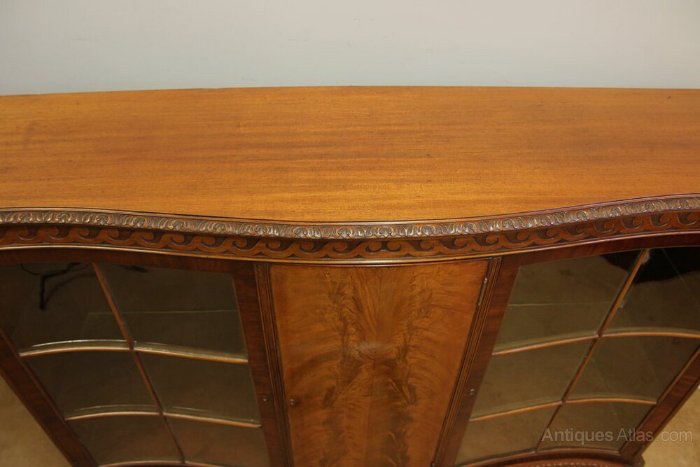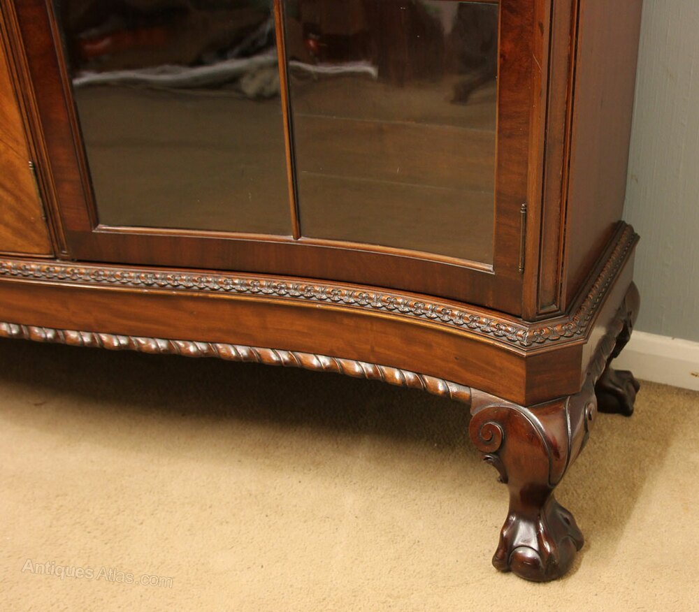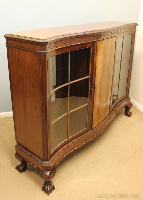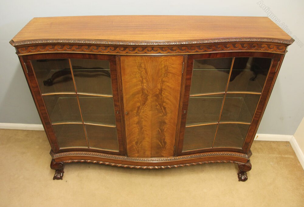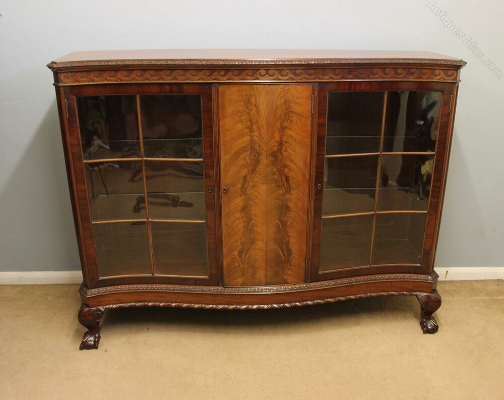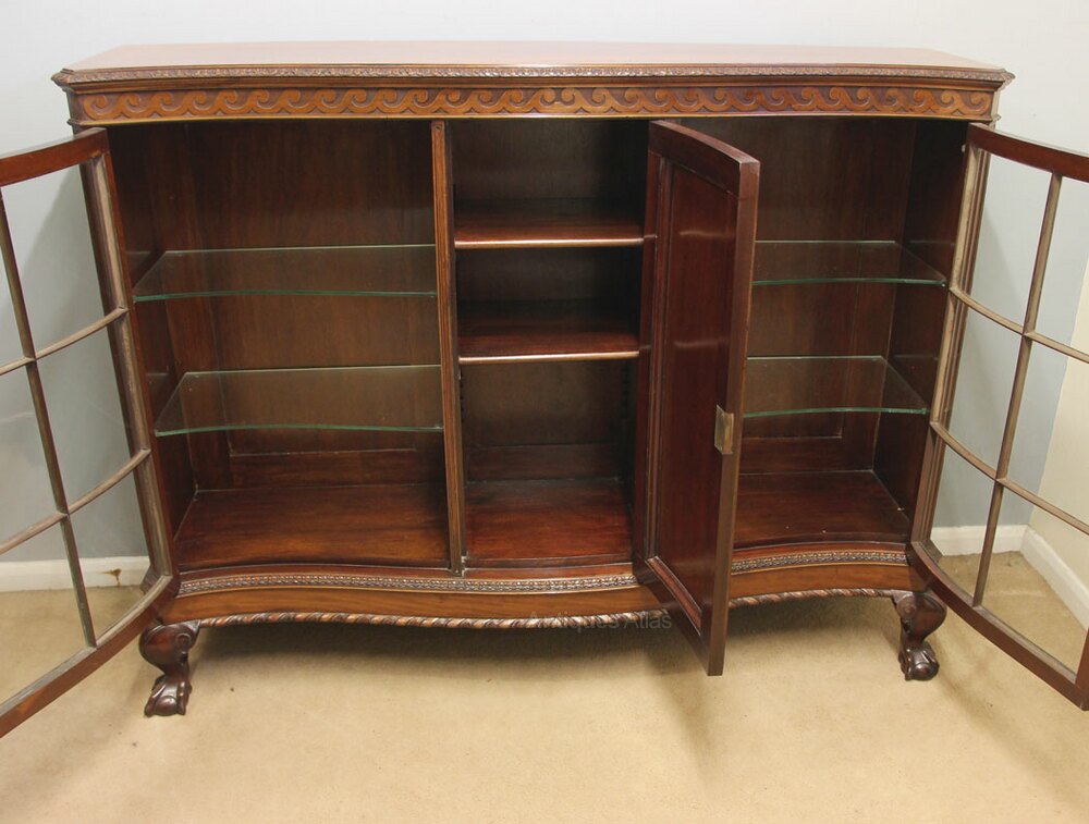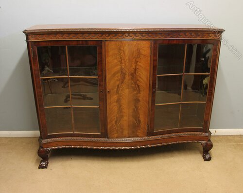 Antique Mahogany Bookcase Display Cabinet, This quality mahogany chippendale style display cabinet has a serpentine shaped front the top having a carved edge. There are two glazed doors with a centre solid cupboard door. The centre interior having two adjustable wood shelves The interior of the glazed doors having glass shelves. The cabinet is supported short shaped legs with ball and claw feet,