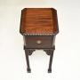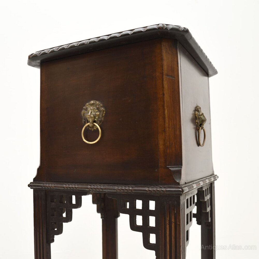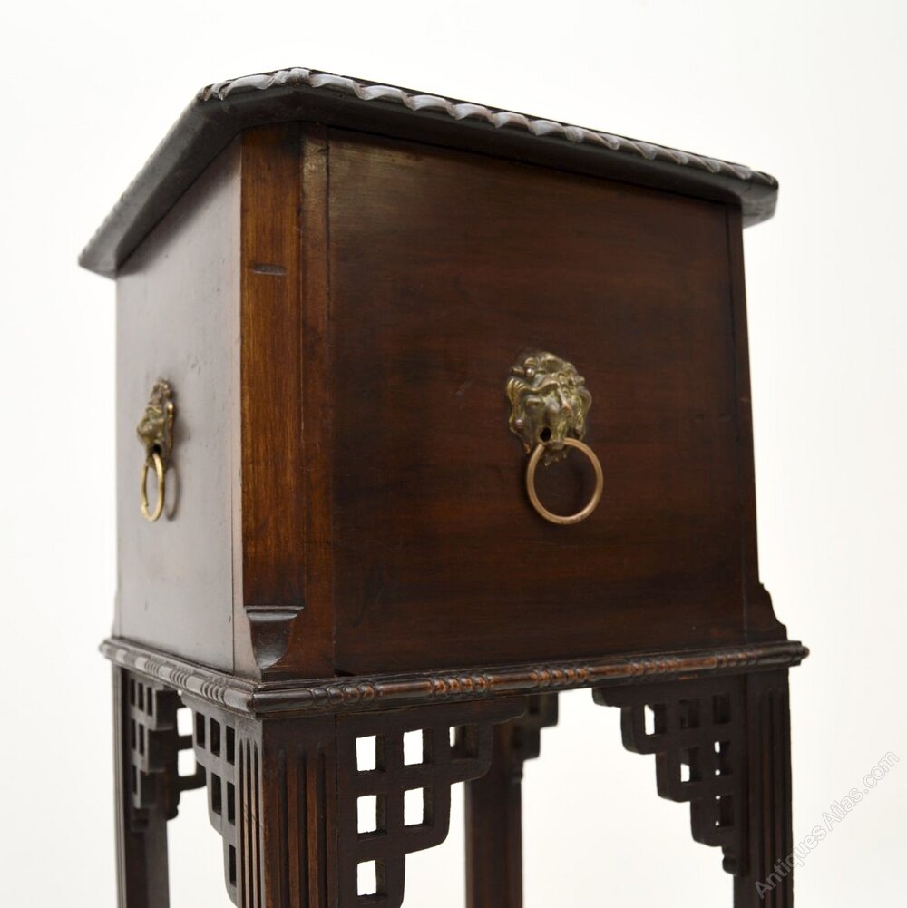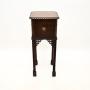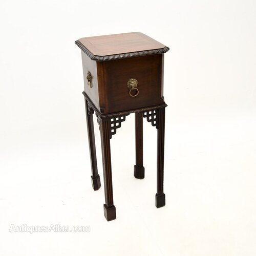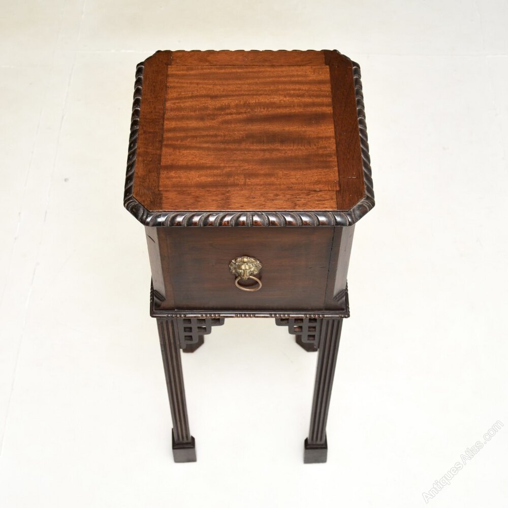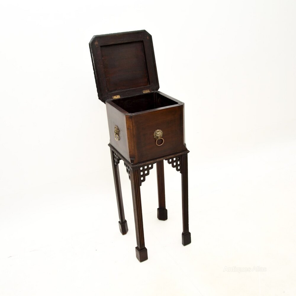 This is of great quality and is a useful size to be used as a lamp table or plant stand. The solid mahogany has a gorgeous colour tone and patina, the top flips up and there is useful storage space inside. The top has a nicely carved gadrooned edge, this stands on fantastic grooved legs with beautiful pierced fretwork under each corner. There are brass lions head rings on each side, this is nicely finished on all sides so can be used as a free standing item.