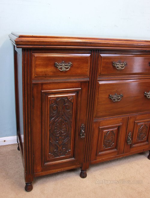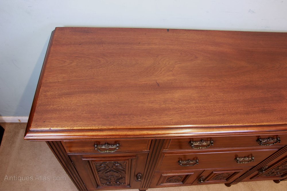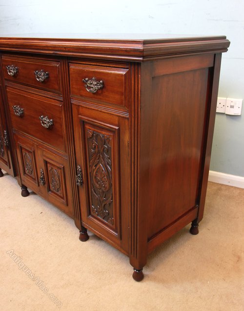Antique late 19th century mahogany sideboard dresser base having a rectangular top with moulded edge under to the centre is two drawers with pair cupboard doors under this is flanked either side by a drawer and cupboard under,
